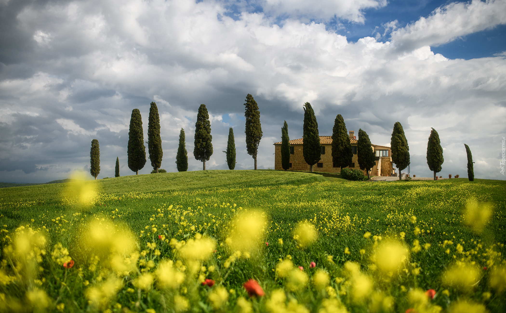 Edytor tapety: Dom ogrodzony cyprysami na wzgórzu w Toskanii