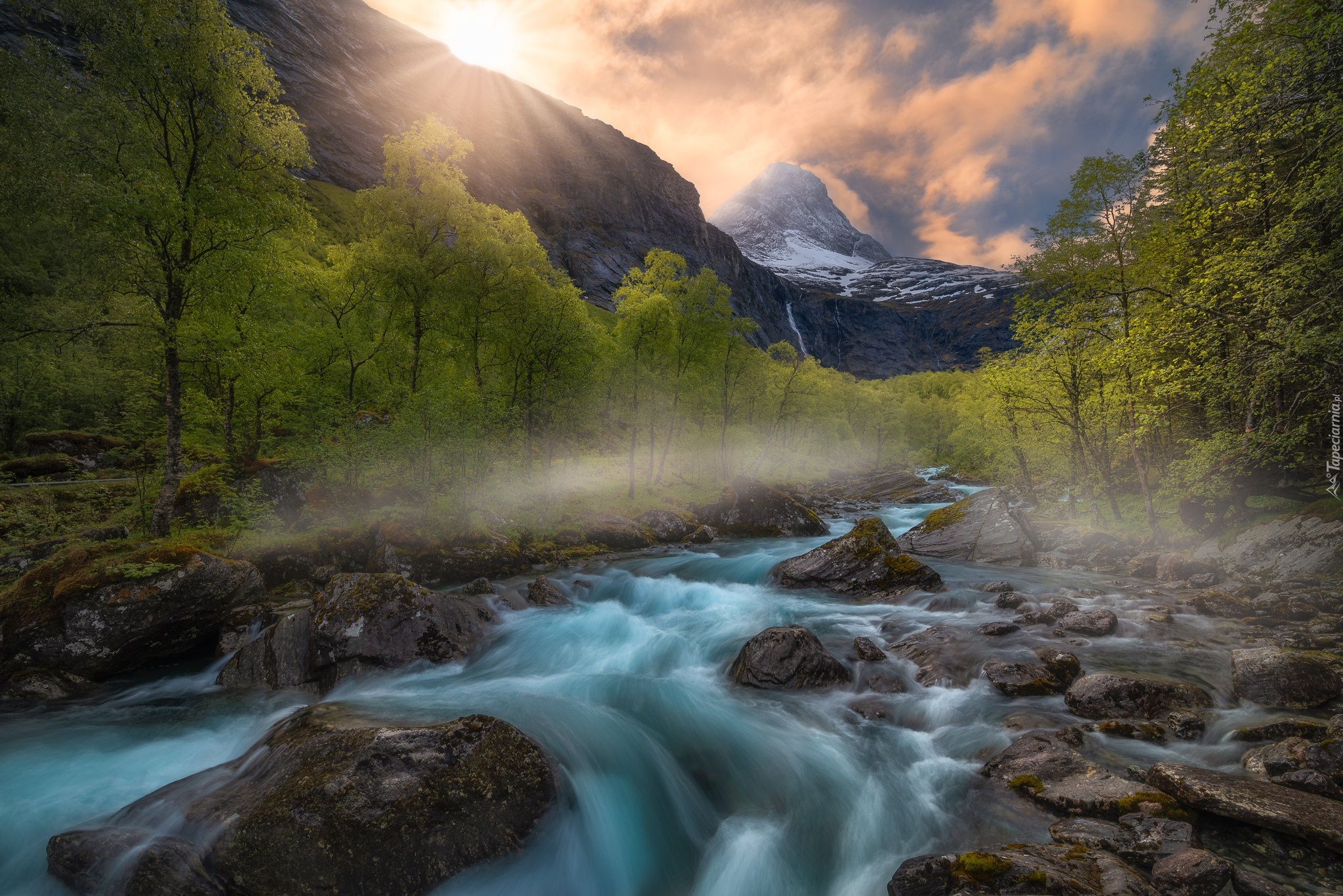 Edytor tapety: Drzewa nad kamienistą rzeką