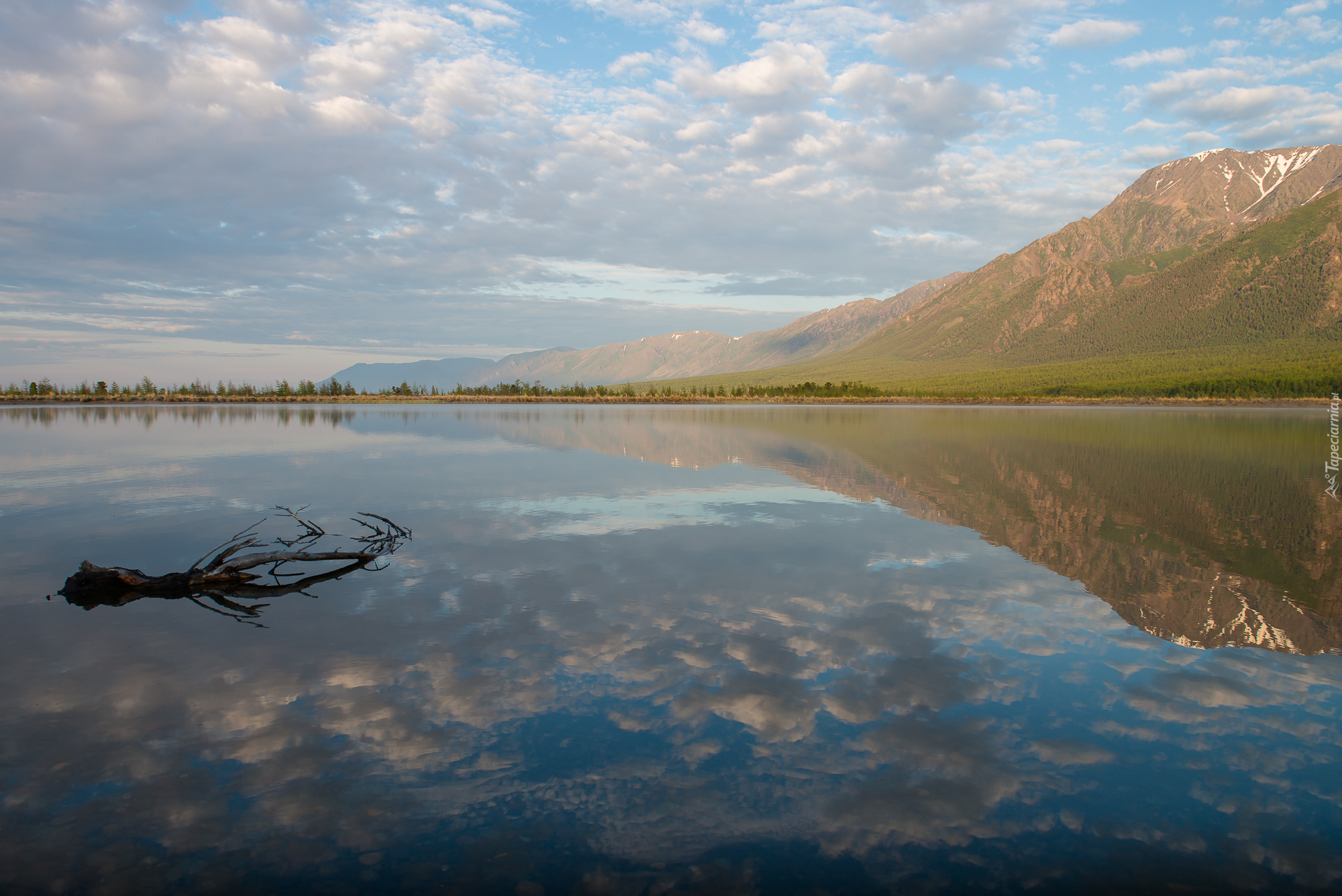 Edytor tapety: Konar drzewa pływający w górskim jeziorze
