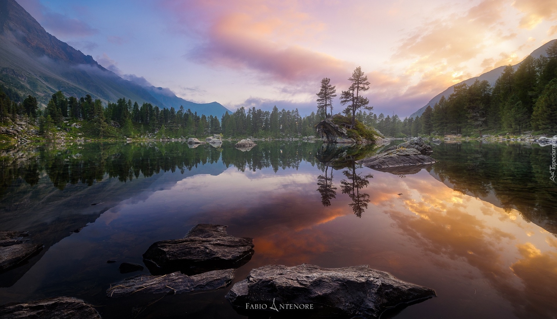 Edytor tapety: Drzewa na skale w szwajcarskim jeziorze Saoseo