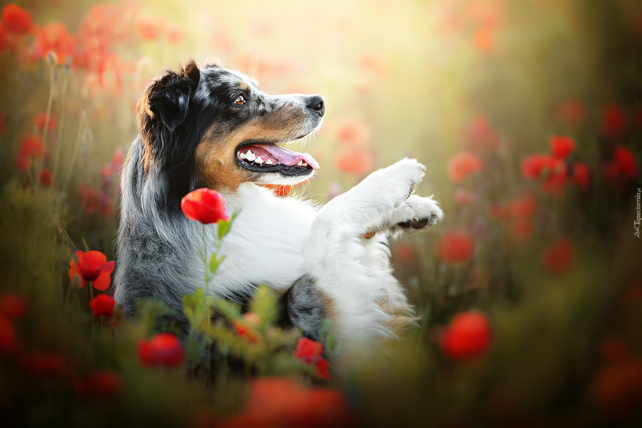 Edytor tapety: Owczarek australijski pośród maków