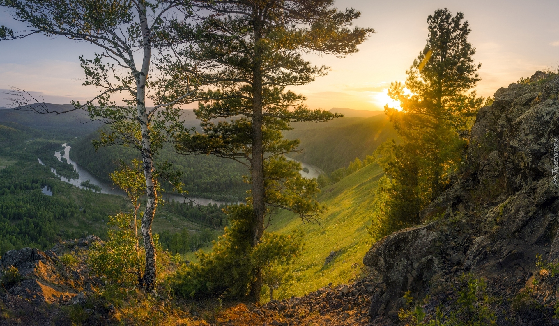 Edytor tapety: Widok spoza drzew na zakole rzeki w dolinie