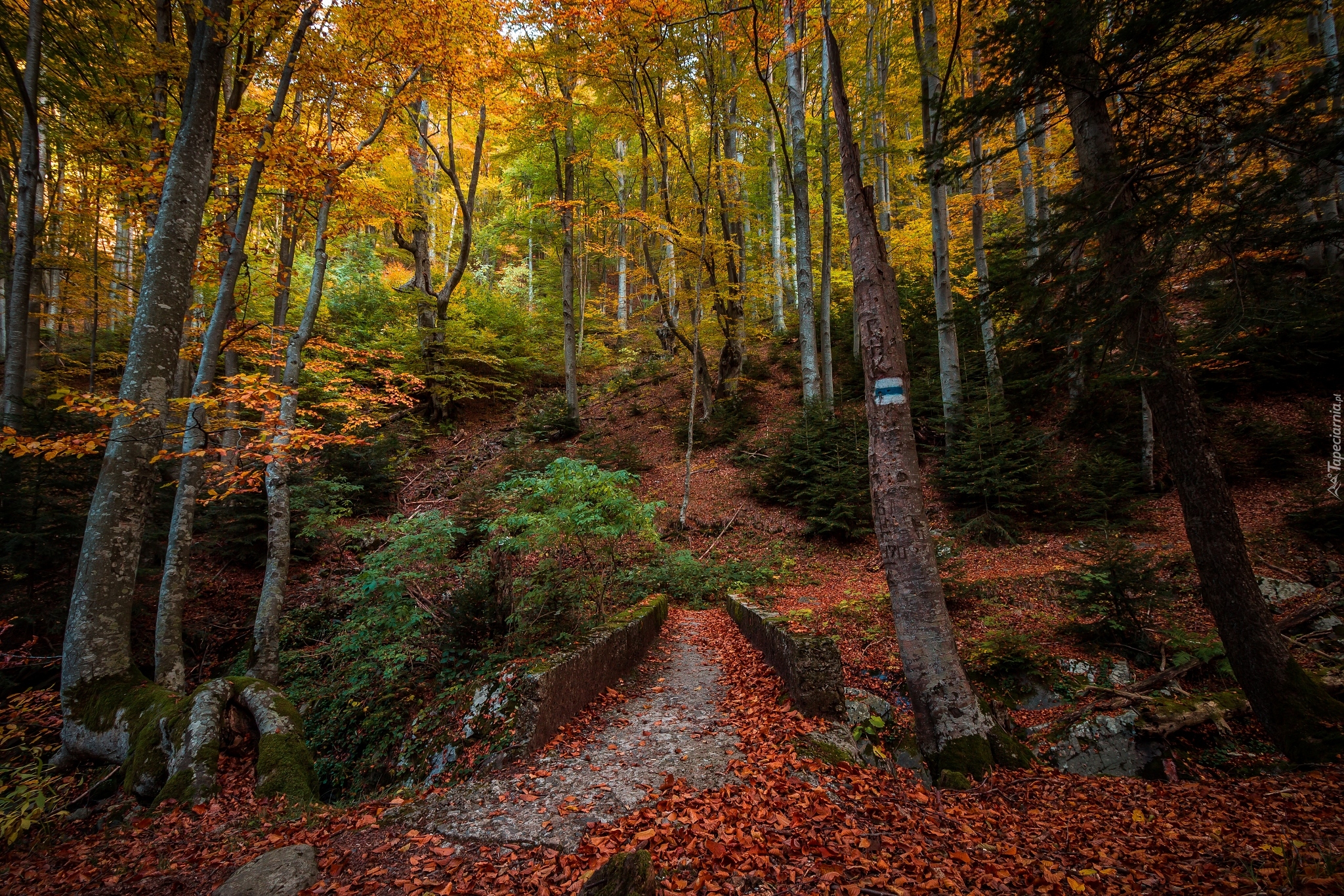 Edytor tapety: Ścieżka przez mały mostek w jesiennym lesie