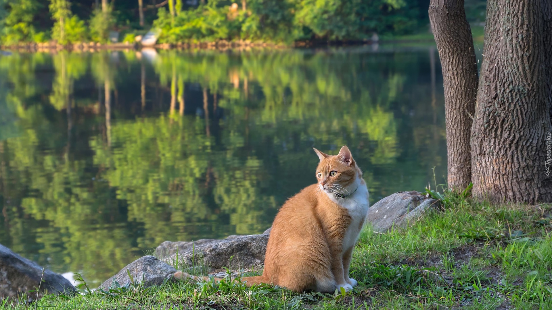 Edytor tapety: Rudo-biały kot obok kamieni przy stawie