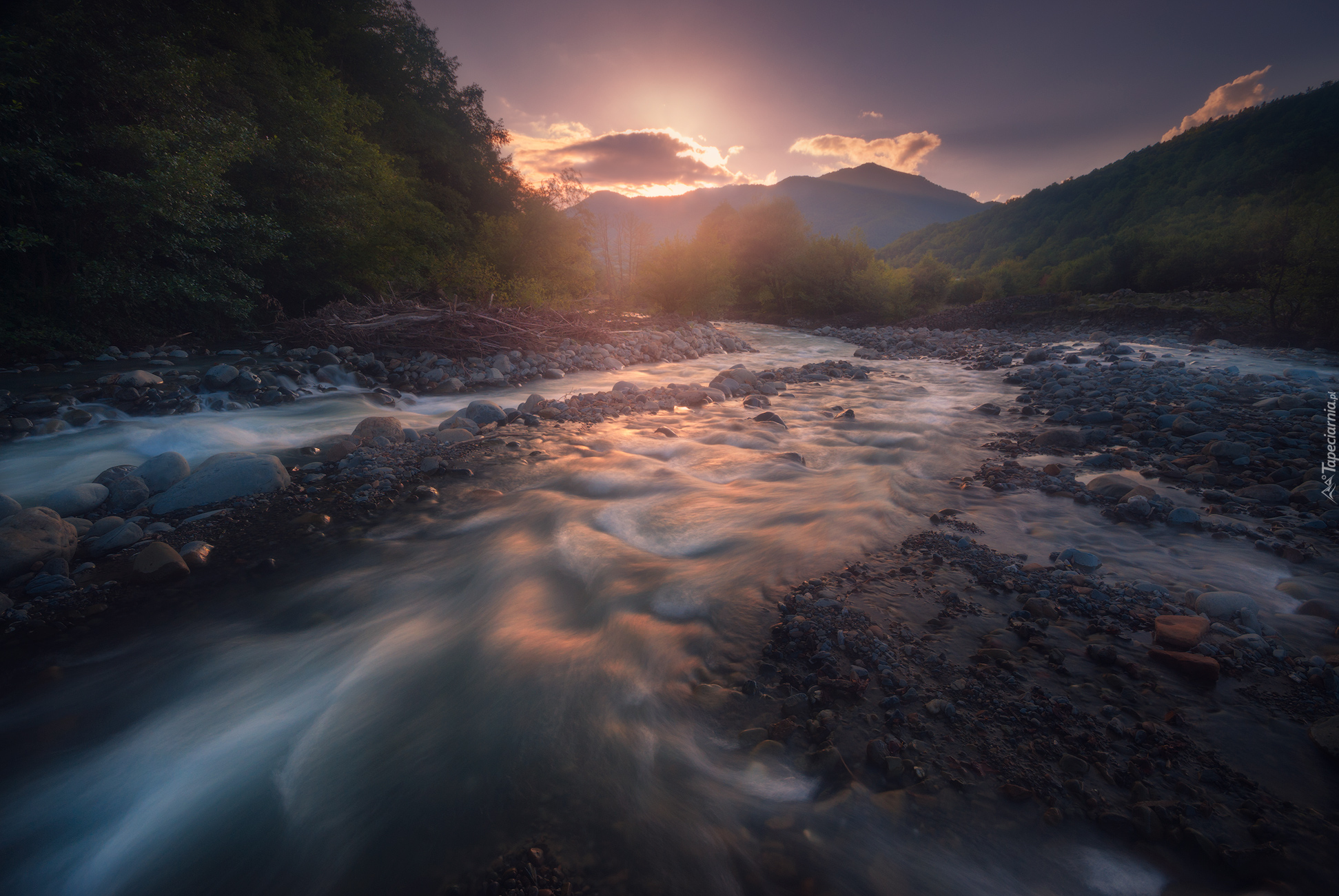 Edytor tapety: Kamienista rzeka rozświetlona wschodem słońca