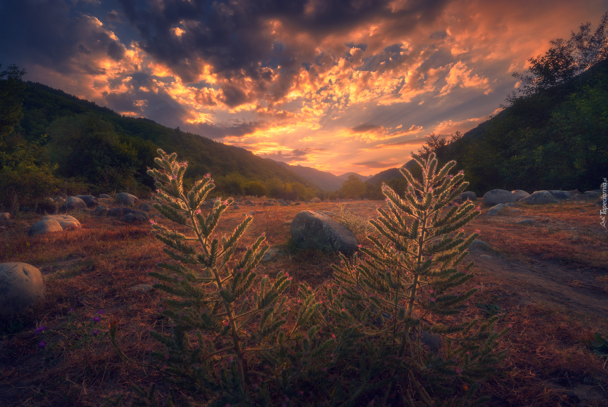 Edytor tapety: Wschód słońca nad górską polaną