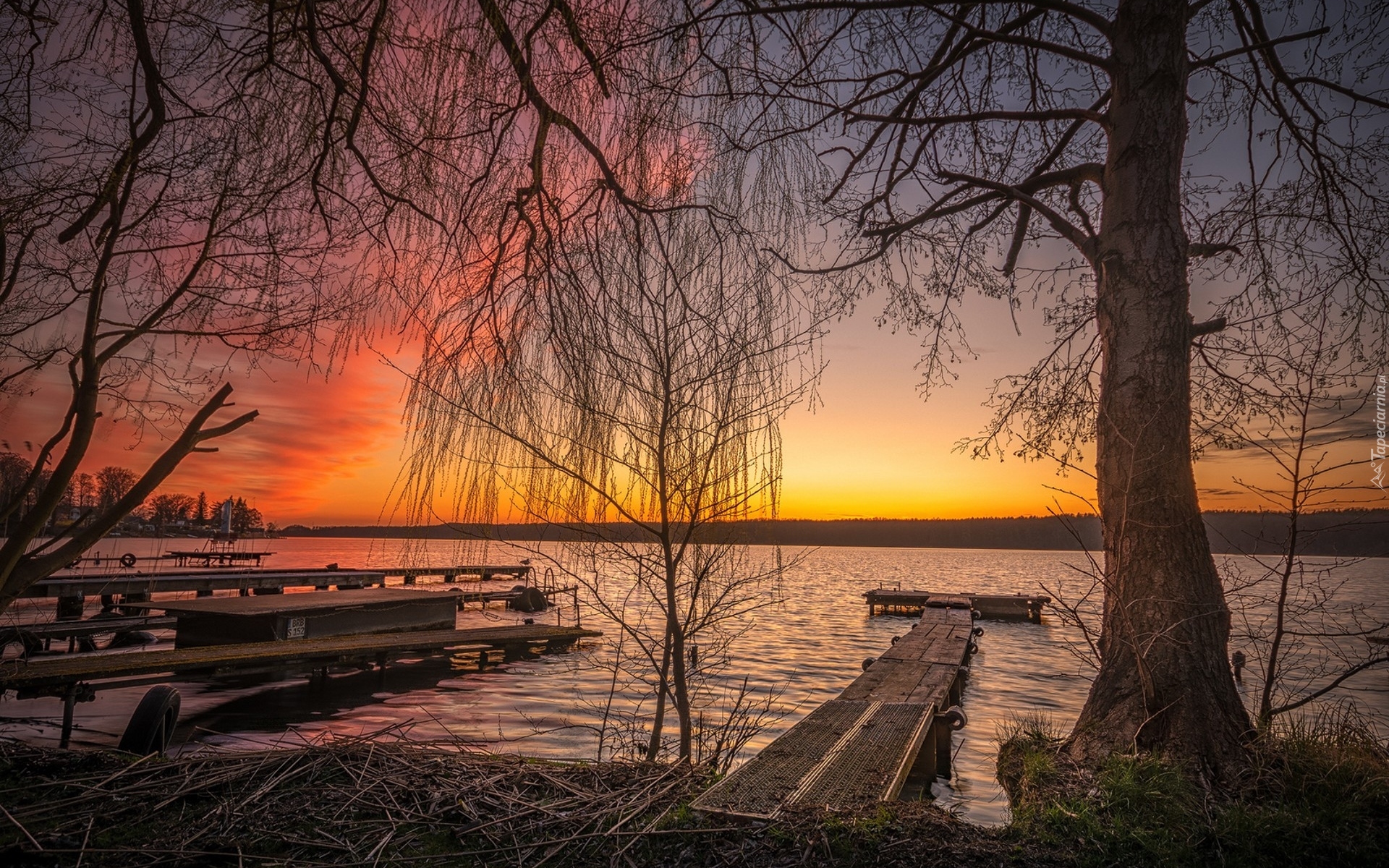 Edytor tapety: Pomosty nad jeziorem o zachodzie słońca