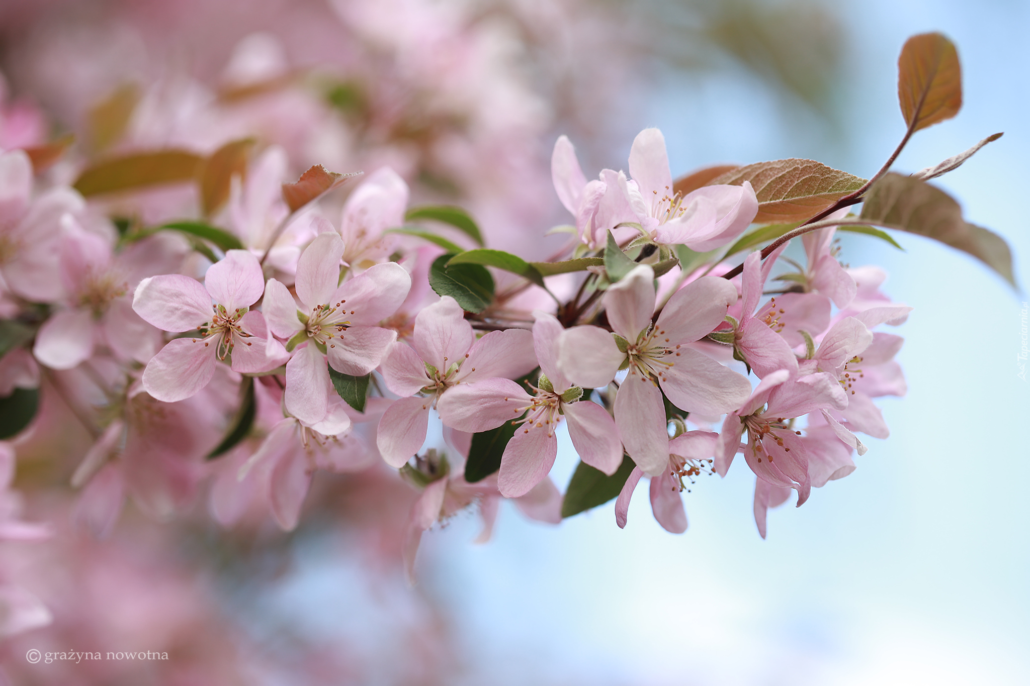 Edytor tapety: Gałązka z różowymi kwiatkami i listkami