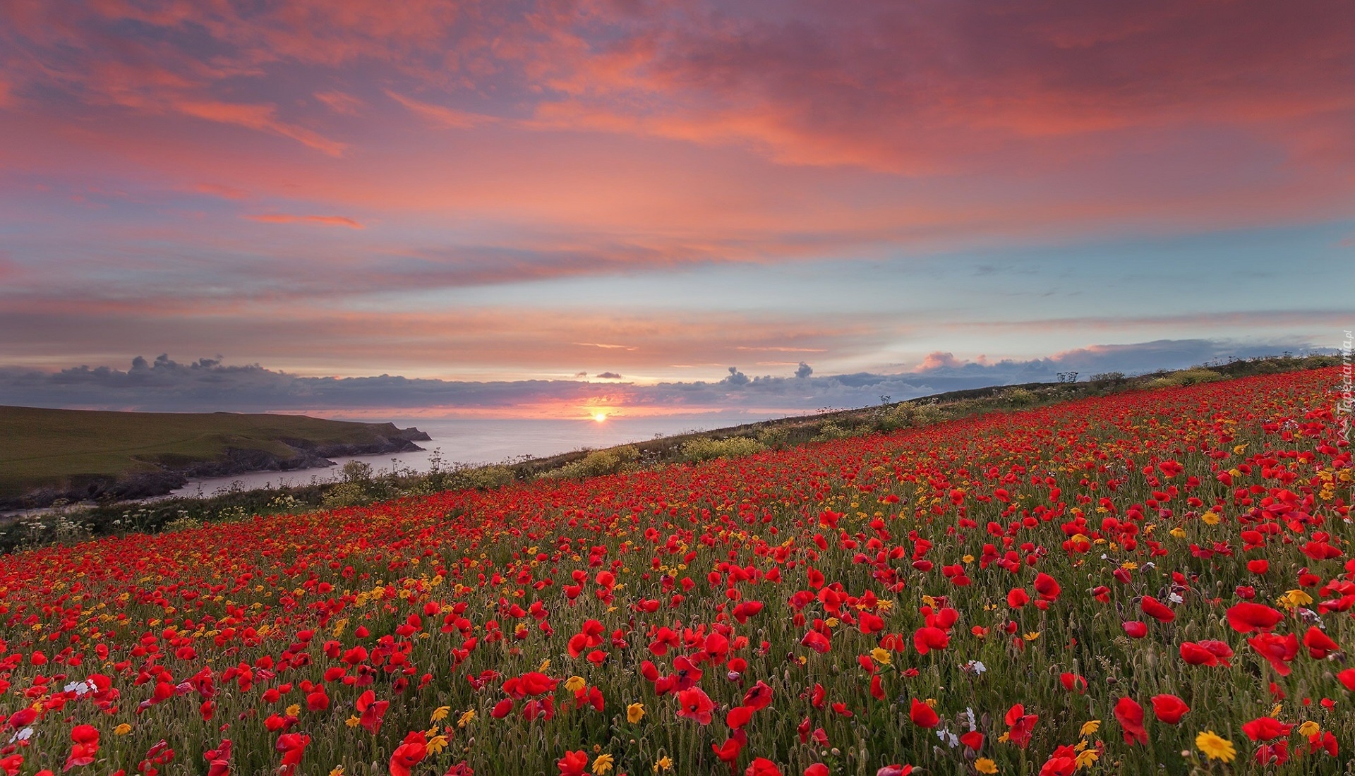 Edytor tapety: Zachodzące słońce nad łąką w makach