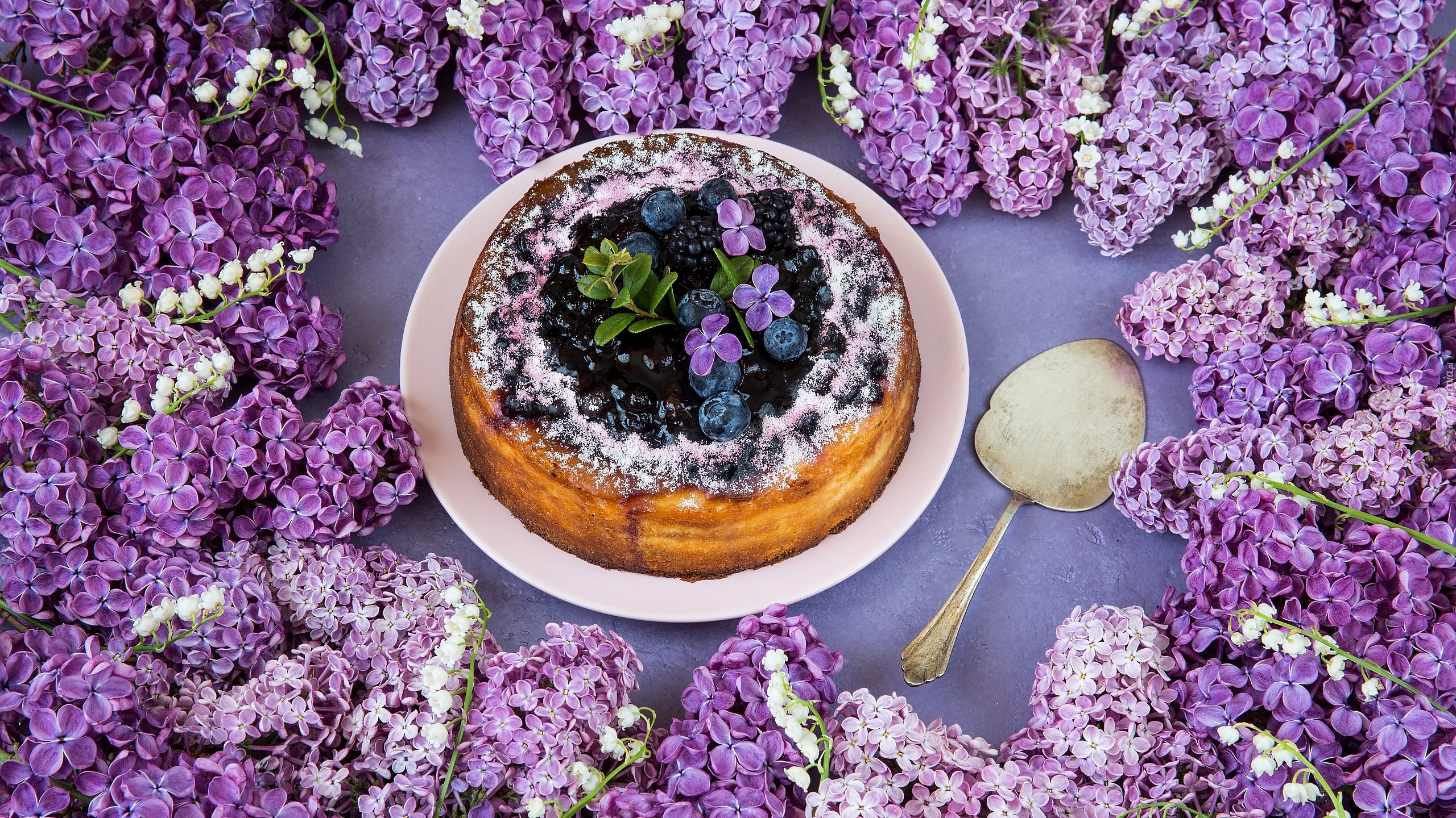Edytor tapety: Ciasto z jagodami obok bzu