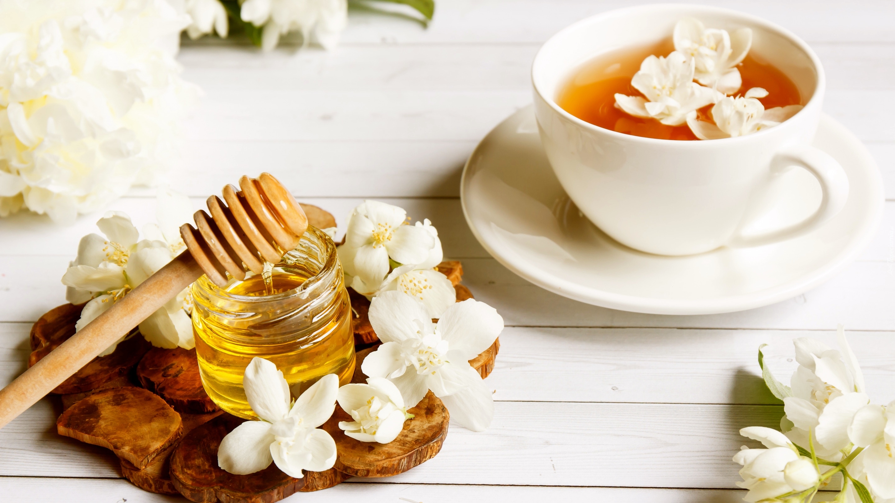 Edytor tapety: Słoiczek miodu obok filiżanki herbaty z jaśminem