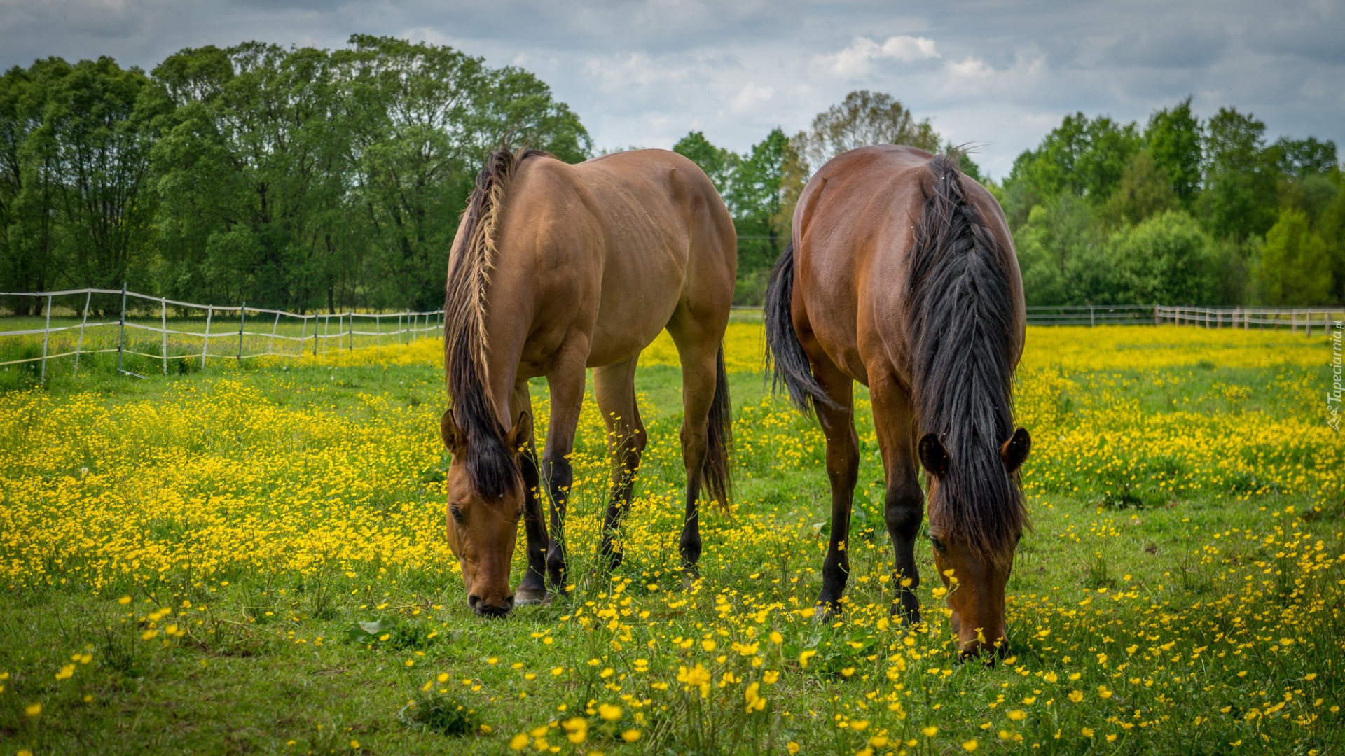 Edytor tapety: Dwa konie pasące się na kwiecistej łące
