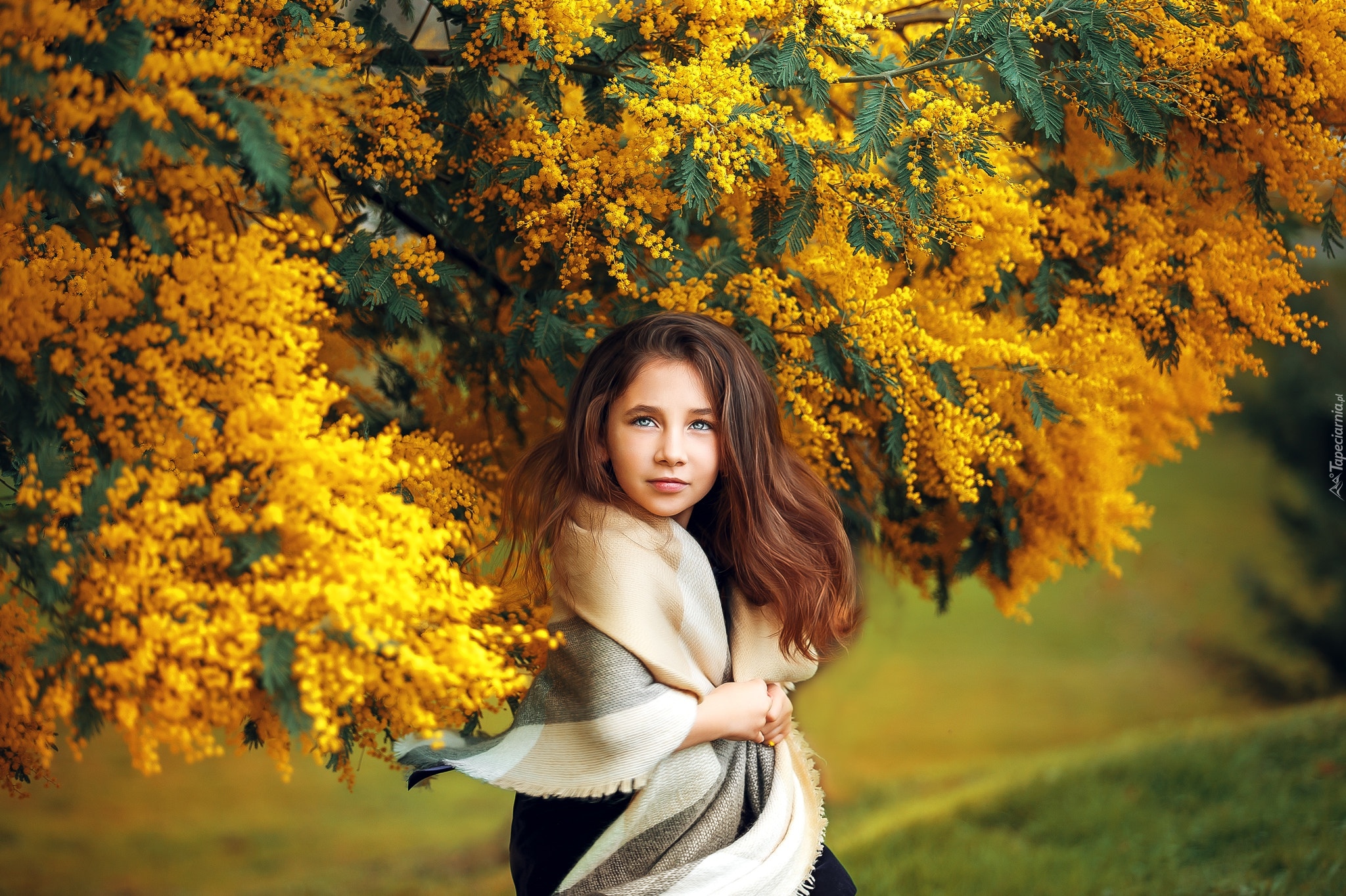 Edytor tapety: Dziewczynka otulona szalem pod akacją srebrzystą