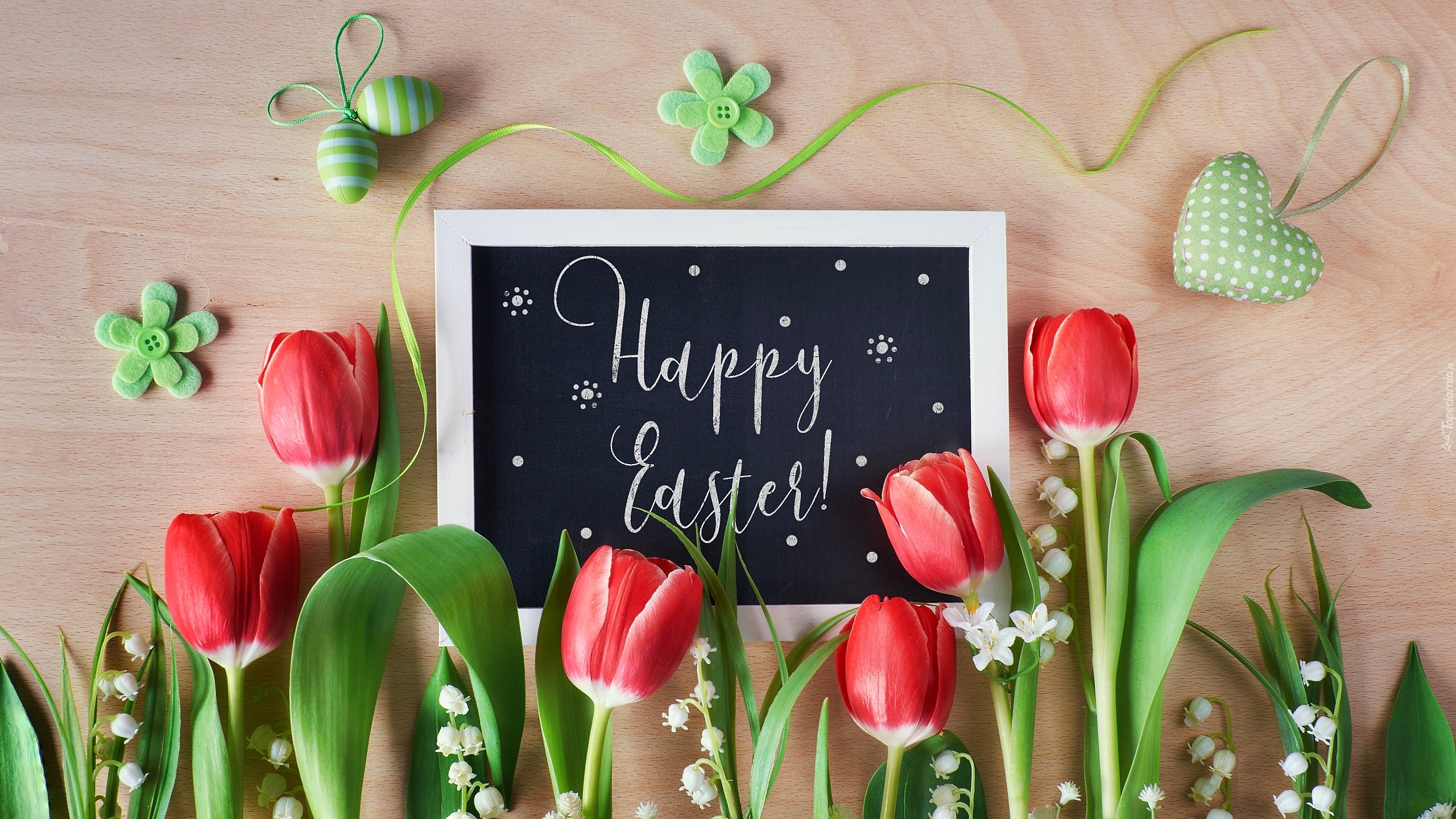 Edytor tapety: Tulipany obok tabliczki z napisem Happy Easter