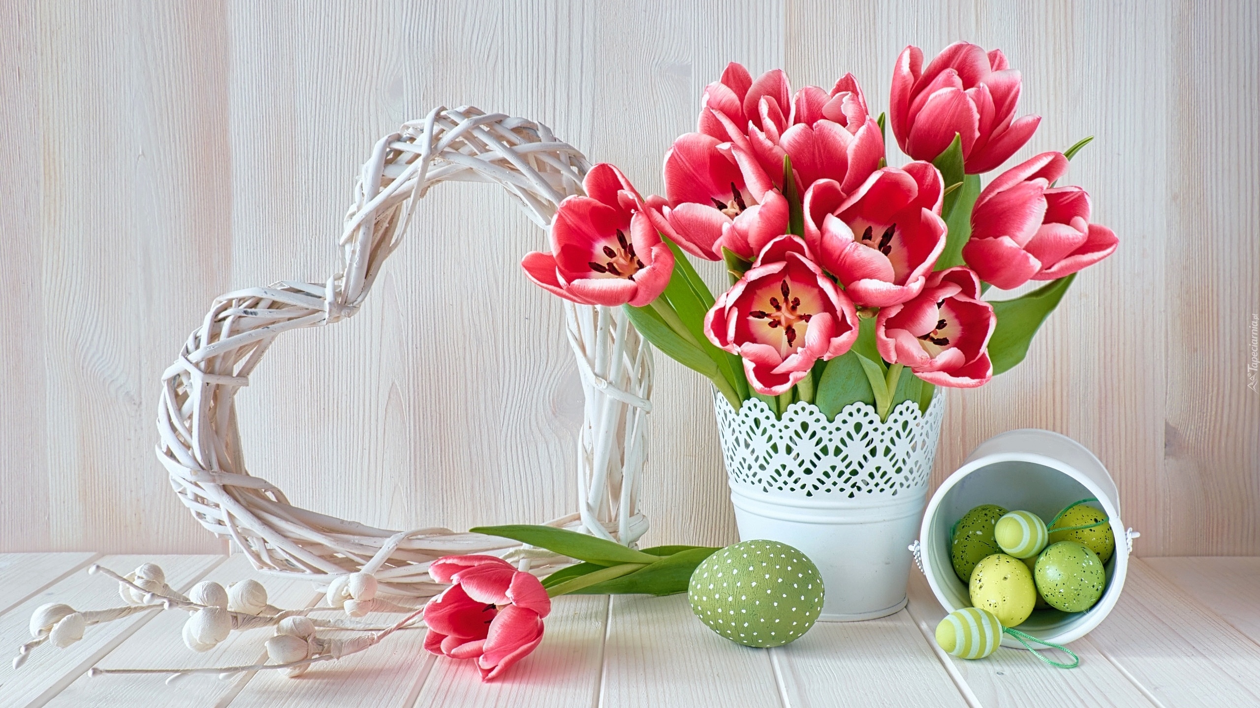 Edytor tapety: Bukiet tulipanów obok serca z wikliny i jajeczek