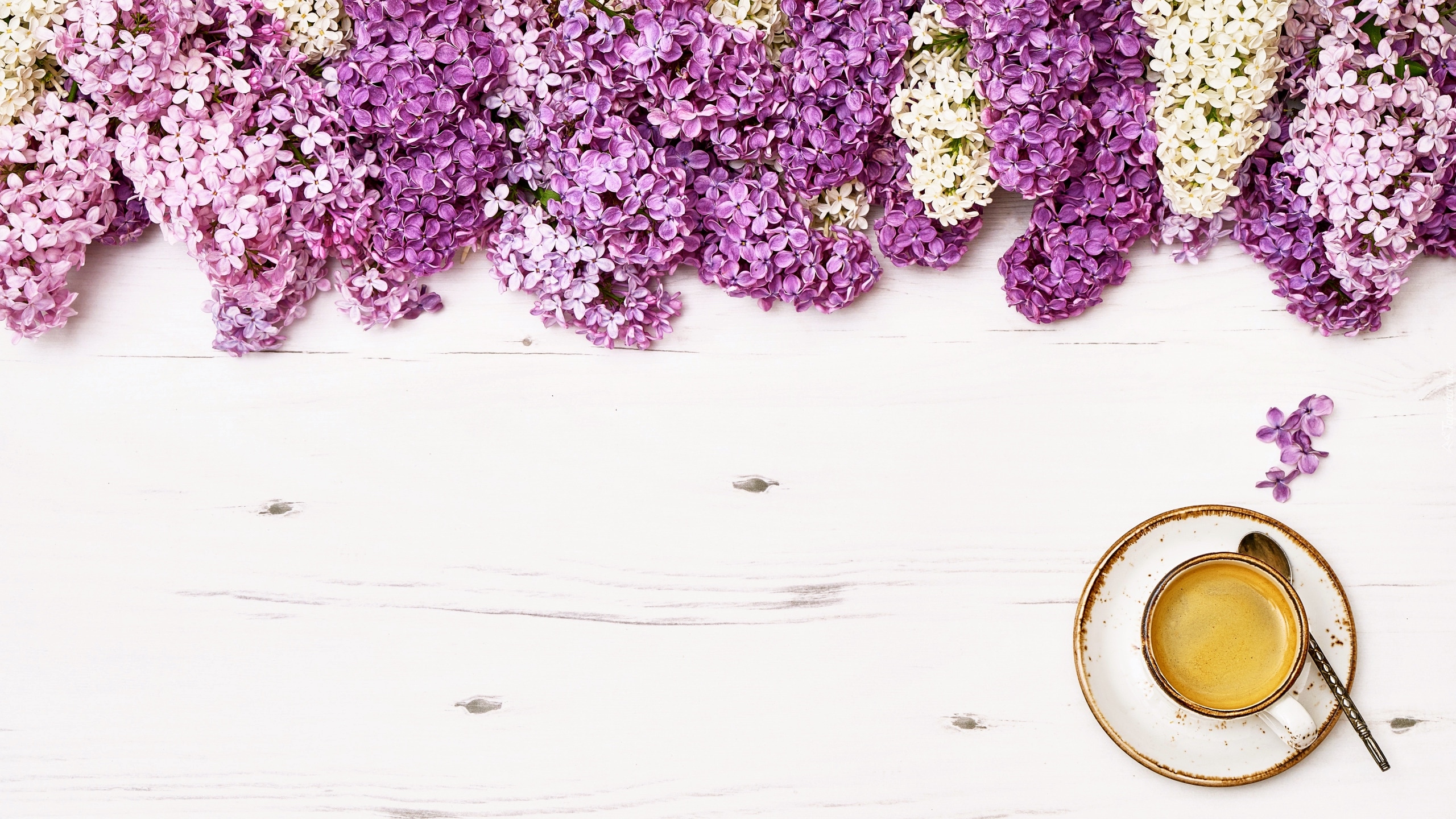 Edytor tapety: Filiżanka z kawą na deskach obok kwiatów bzu