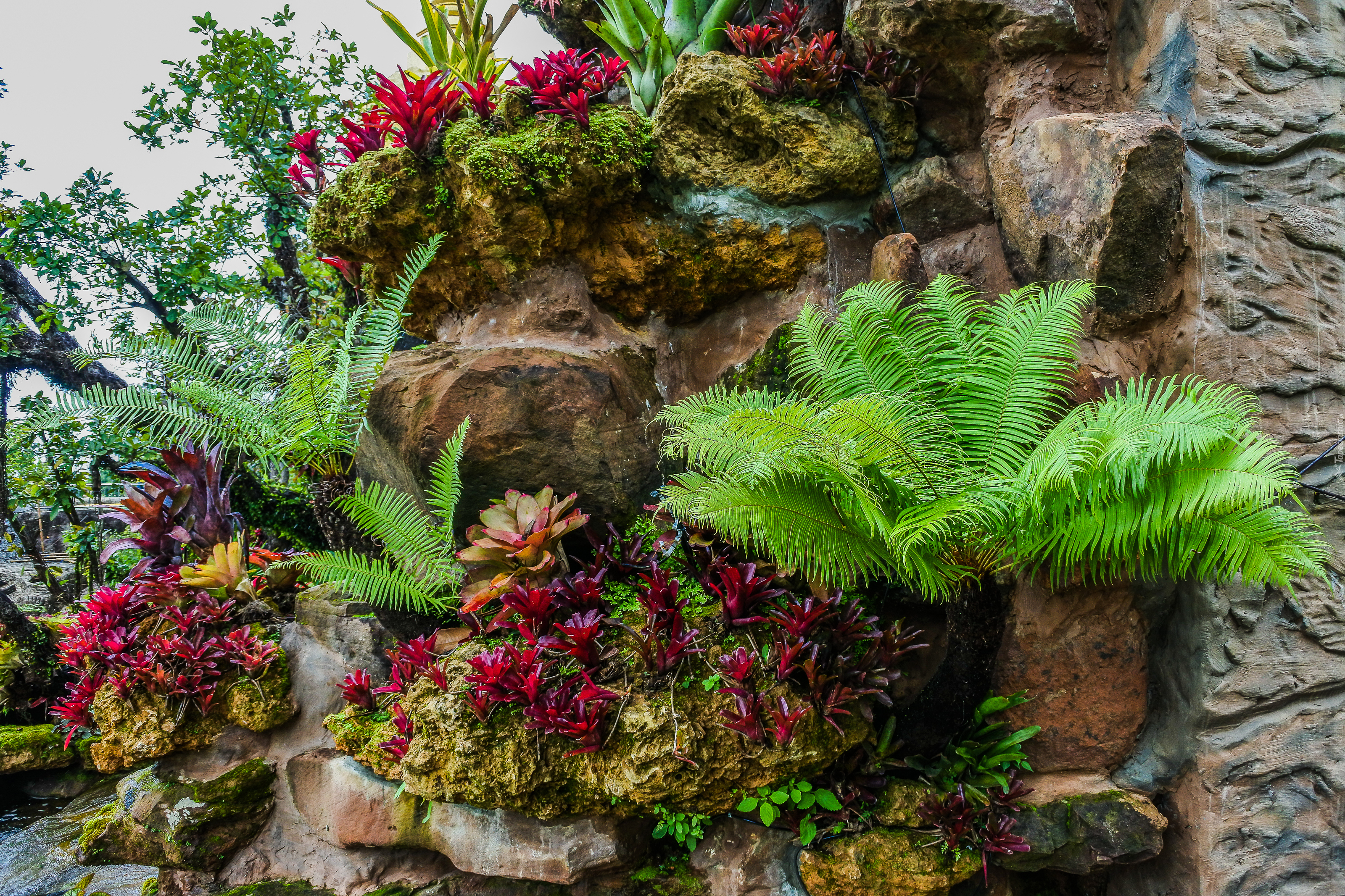 Edytor tapety: Paprocie na skale obok kolorowych roślin