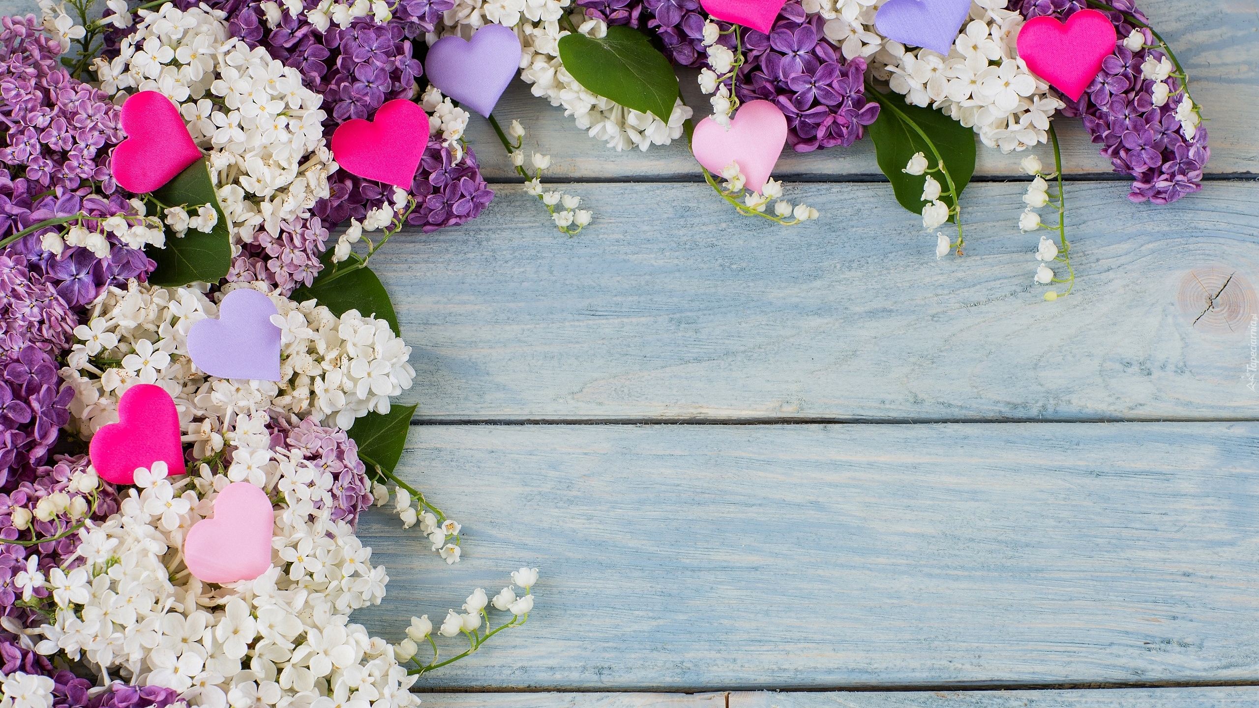 Edytor tapety: Serduszka położone na gałązkach bzu i konwalii