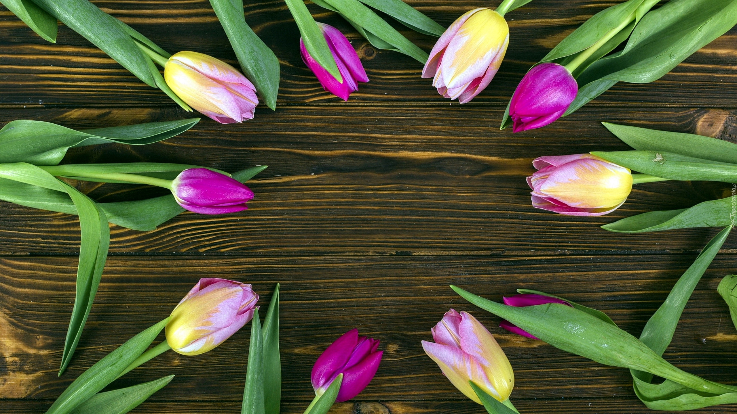 Edytor tapety: Tulipany ułożone w okrąg na deskach