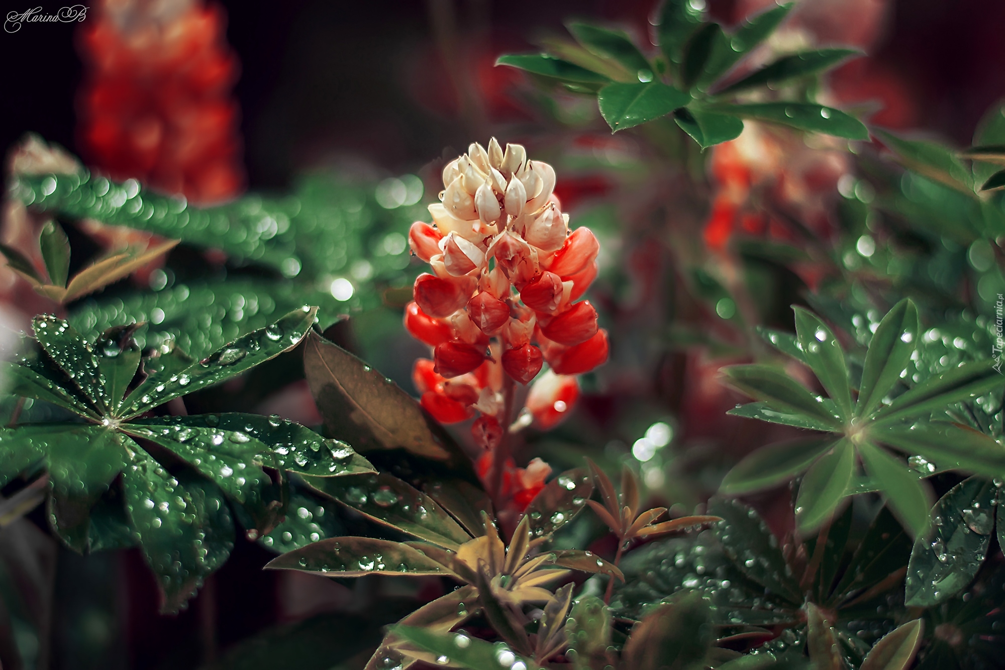 Edytor tapety: Czerwony łubin w kroplach wody