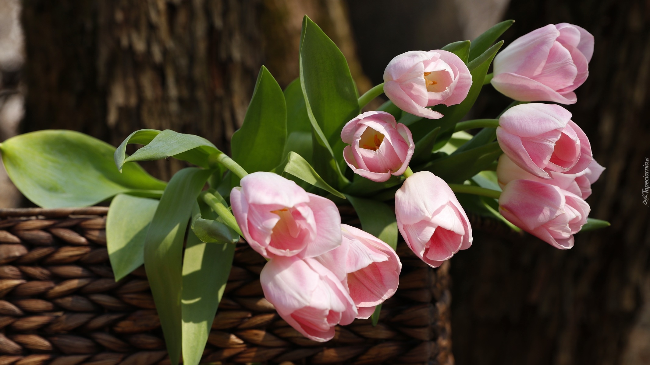 Edytor tapety: Różowe tulipany w koszyku
