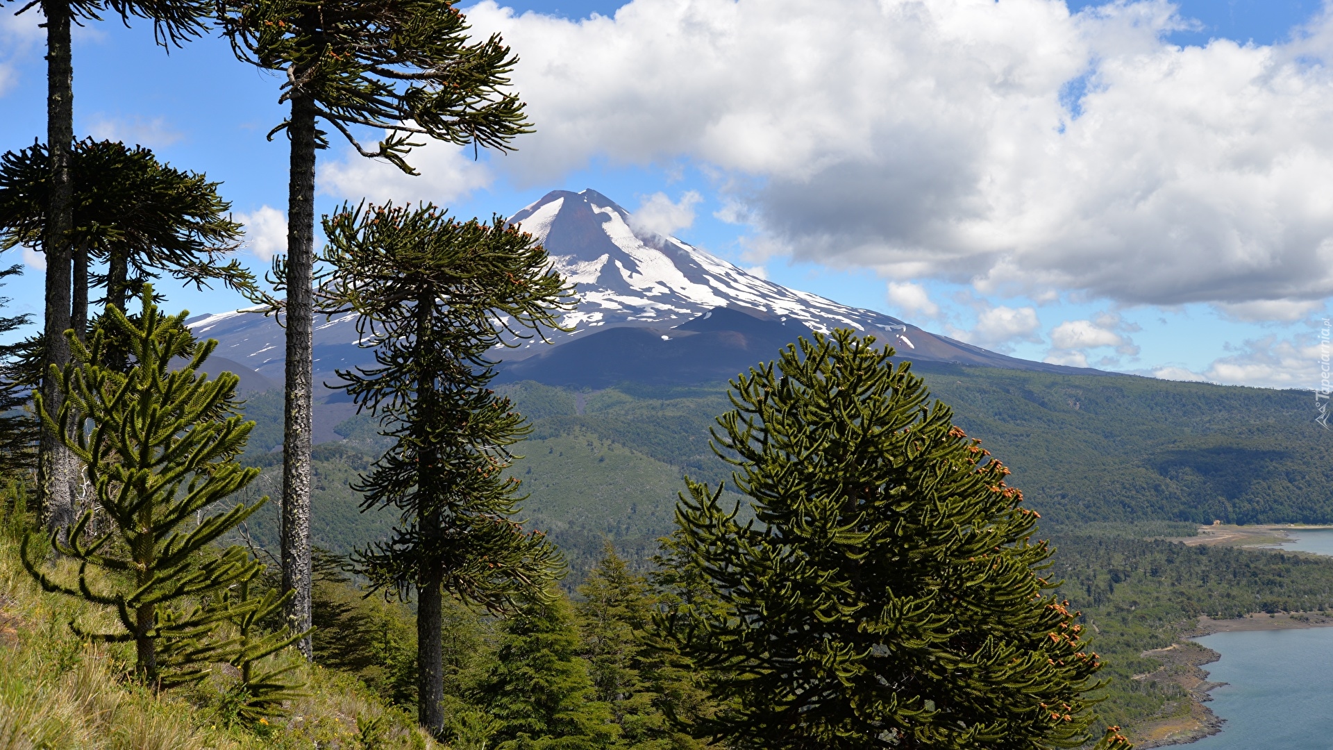 Edytor tapety: Araukarie chilijskie i wulkan Llaima w Chile