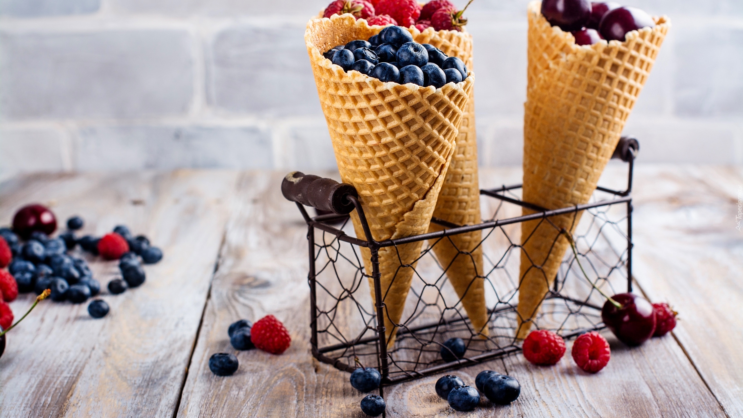 Edytor tapety: Wafelki z owocami w metalowym koszyczku