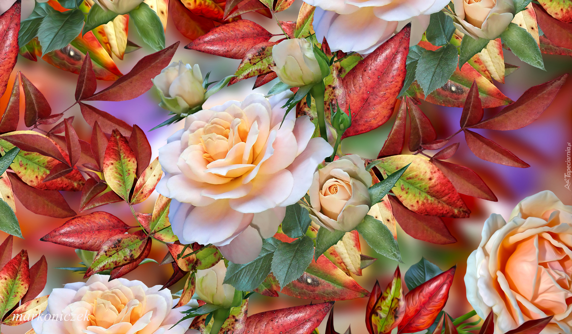 Edytor tapety: Róże i kolorowe liście w grafice