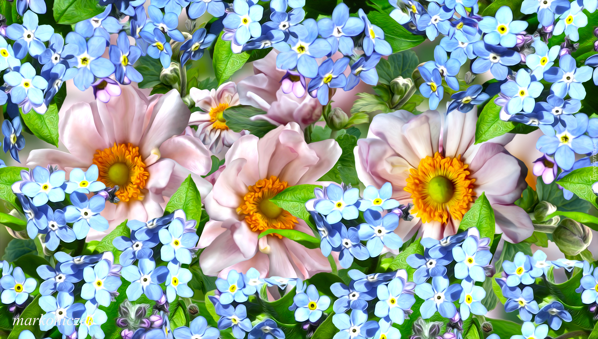 Edytor tapety: Niezapominajki i różowe kwiaty