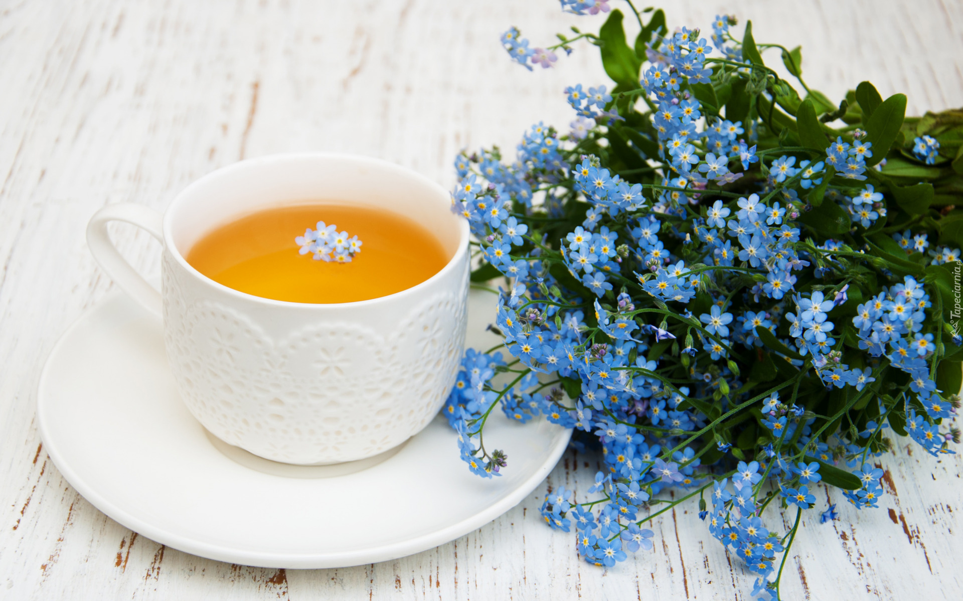 Edytor tapety: Bukiecik niezapominajek obok filiżanki herbaty