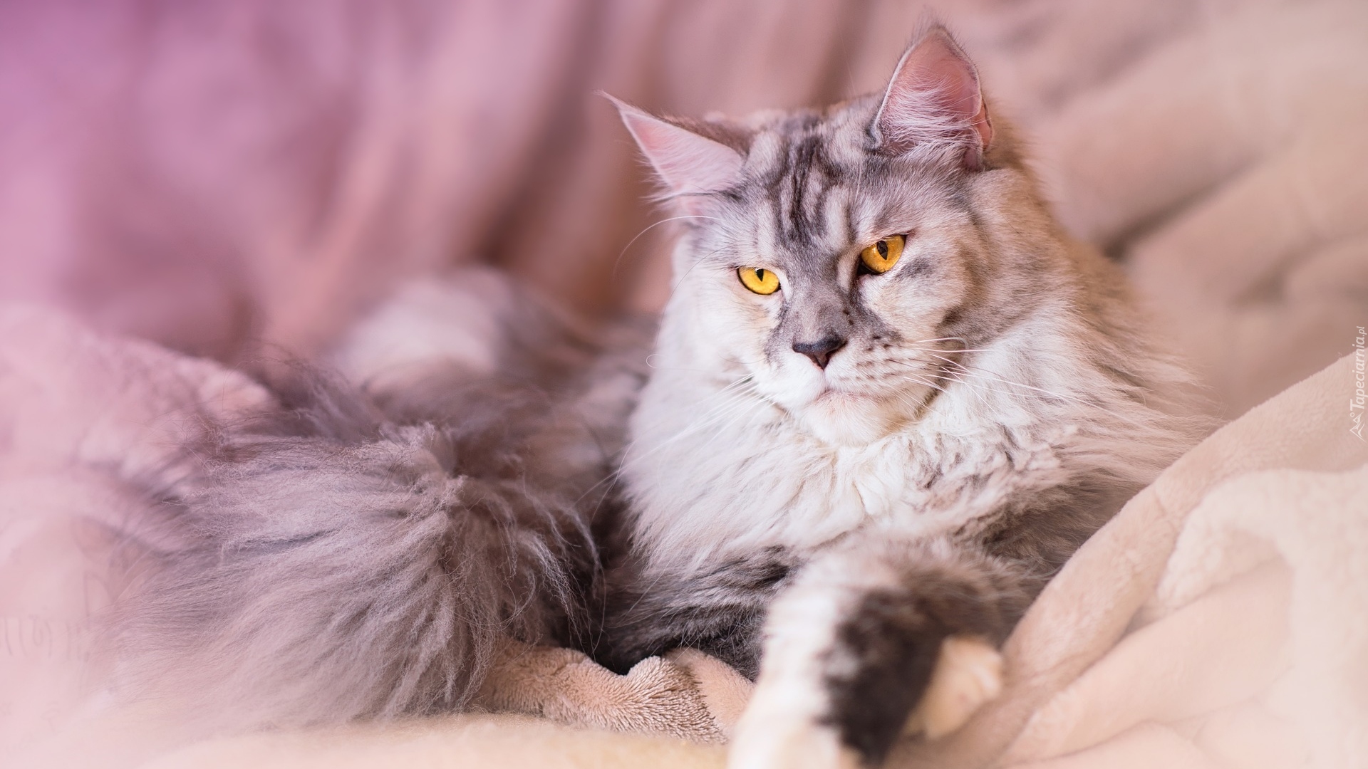 Edytor tapety: Leżący maine coon o żółtych oczach