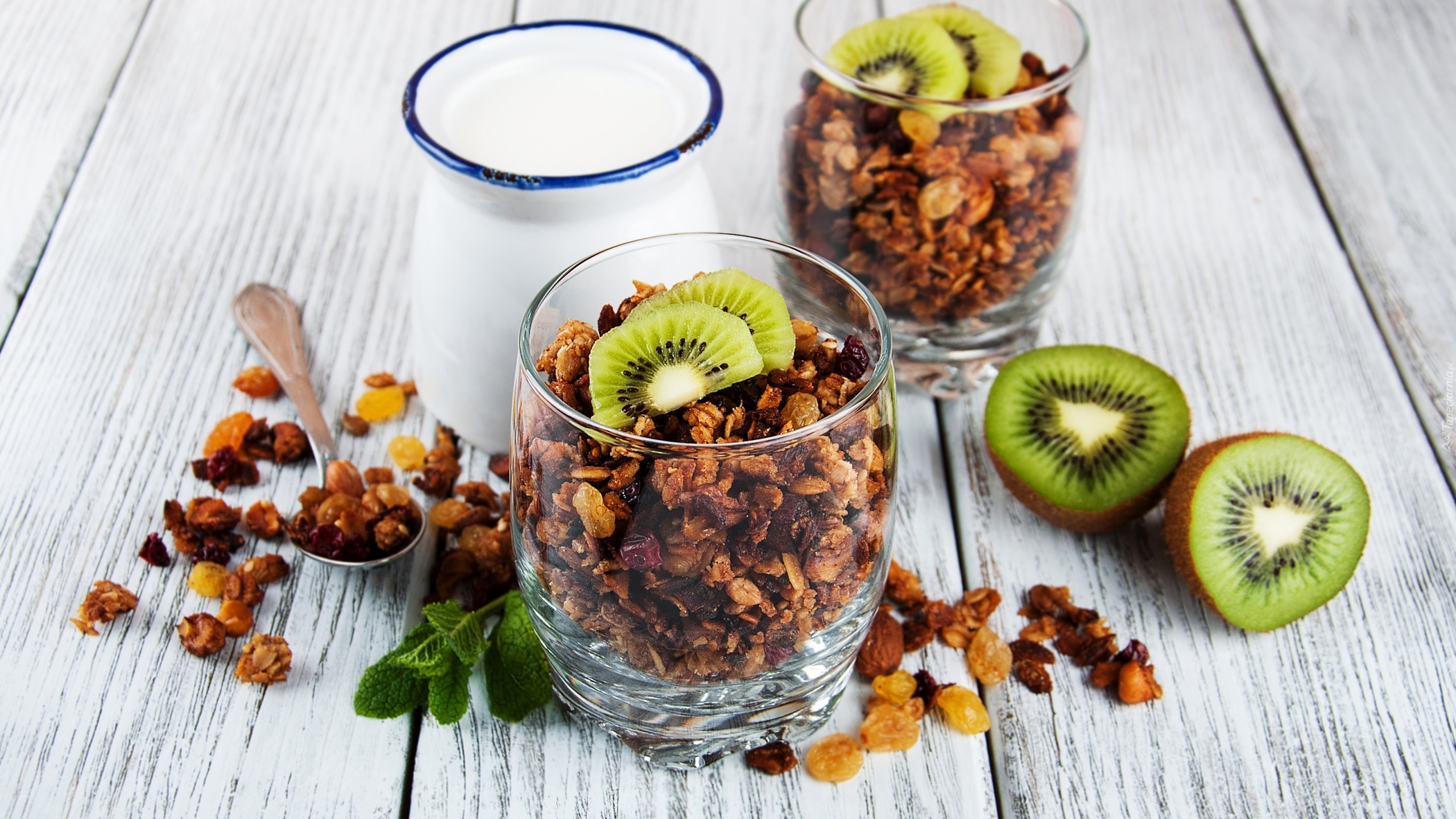 Edytor tapety: Granola w szklankach obok mleka i owoców kiwi