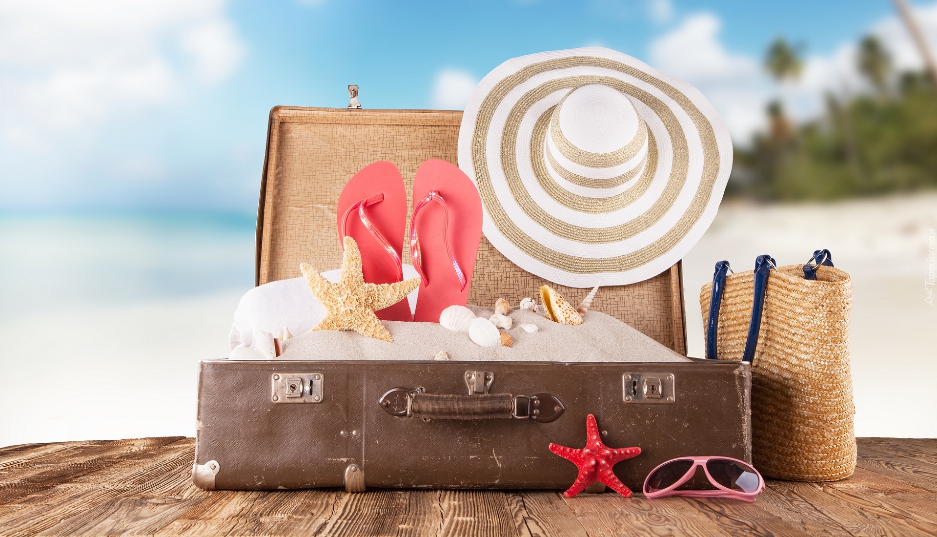 Edytor tapety: Walizka z wakacyjnymi akcesoriami