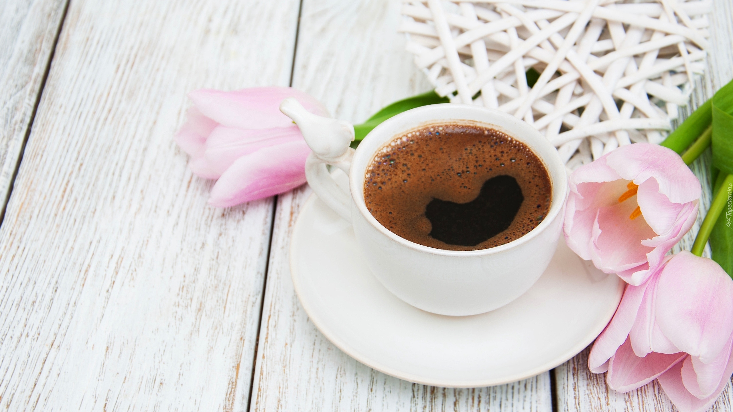Edytor tapety: Tulipany położone obok filiżanki z kawą