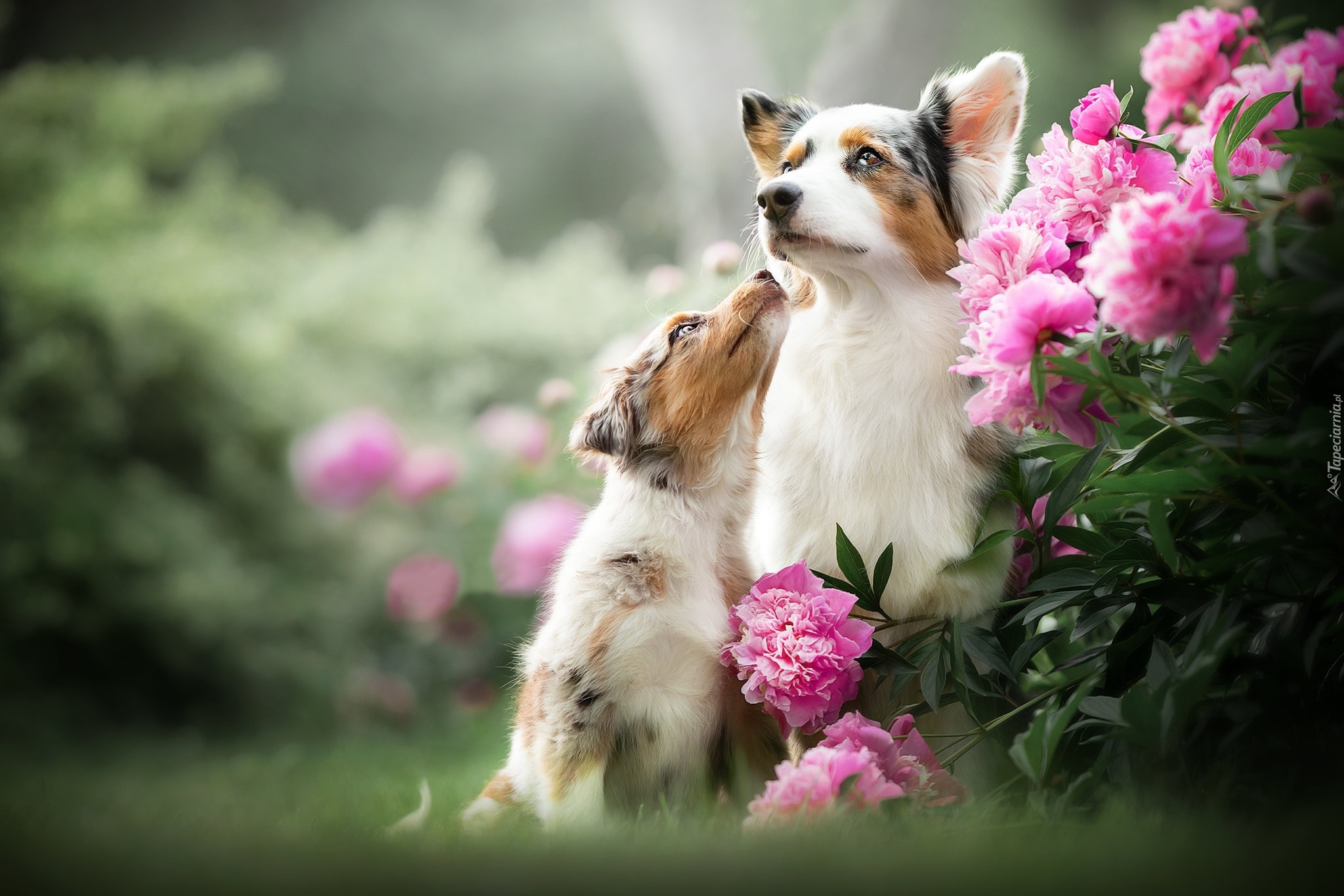 Edytor tapety: Dwa psy obok różowych piwonii