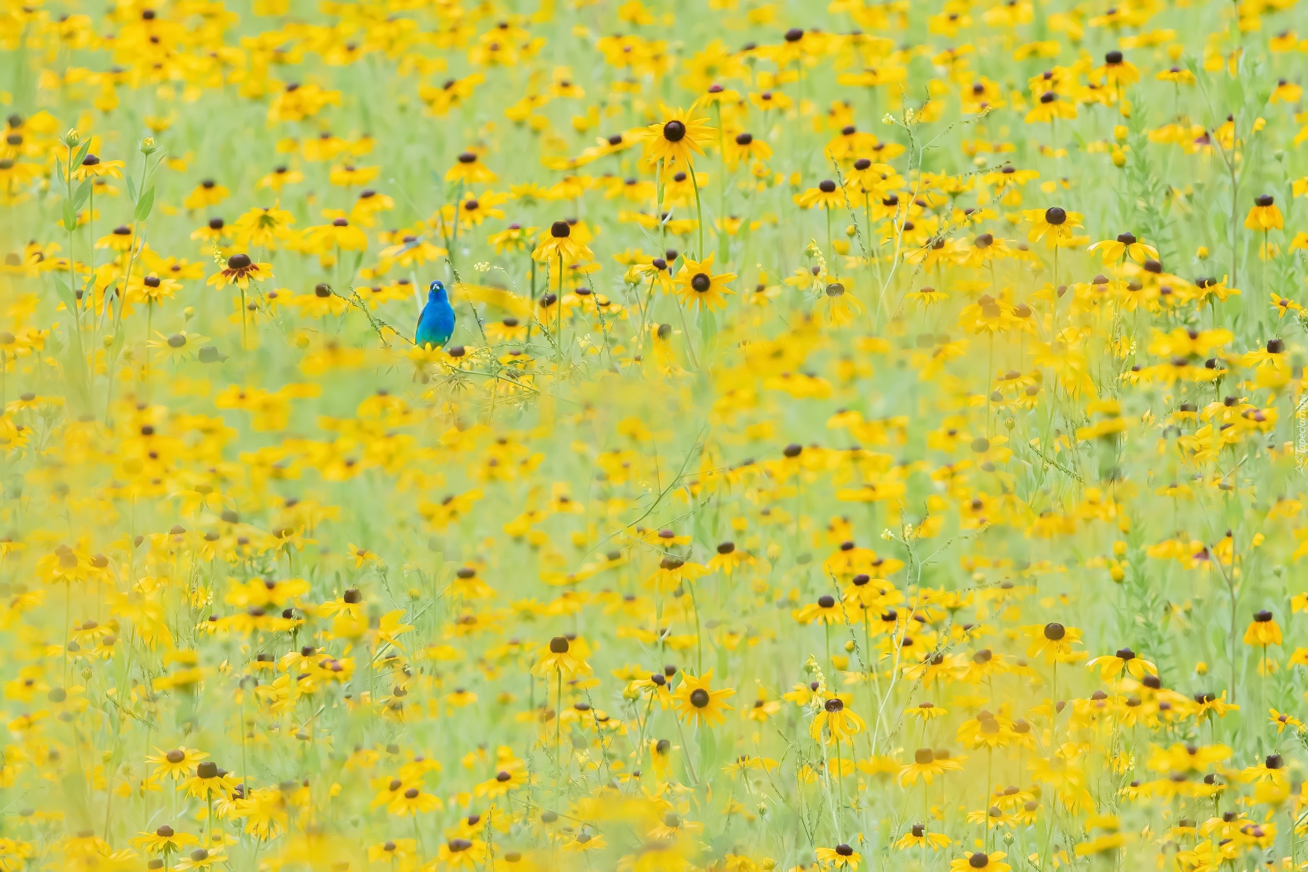 Edytor tapety: Niebieski ptak na kwiatach rudbekii