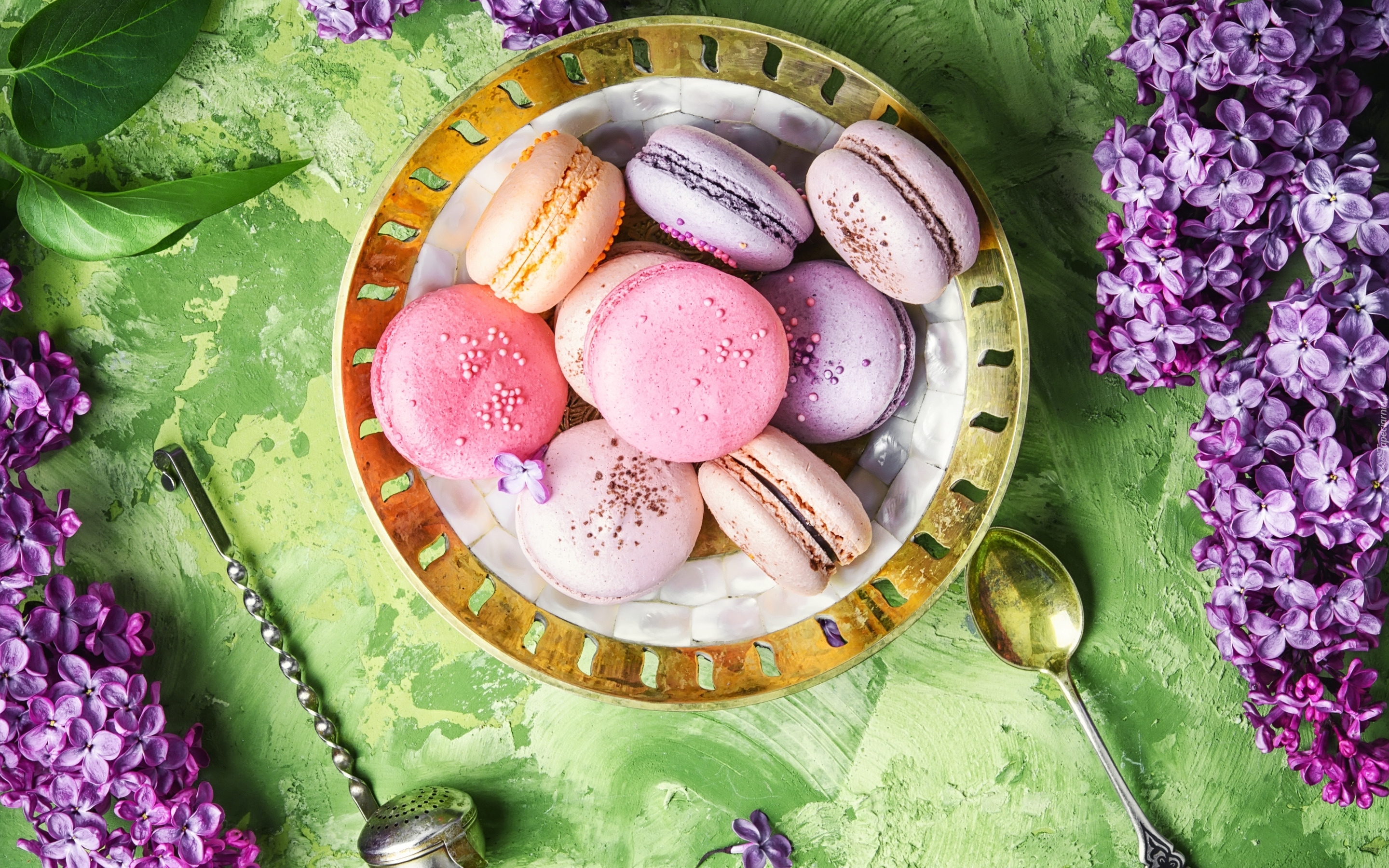 Edytor tapety: Makaroniki na talerzu pośród bzu