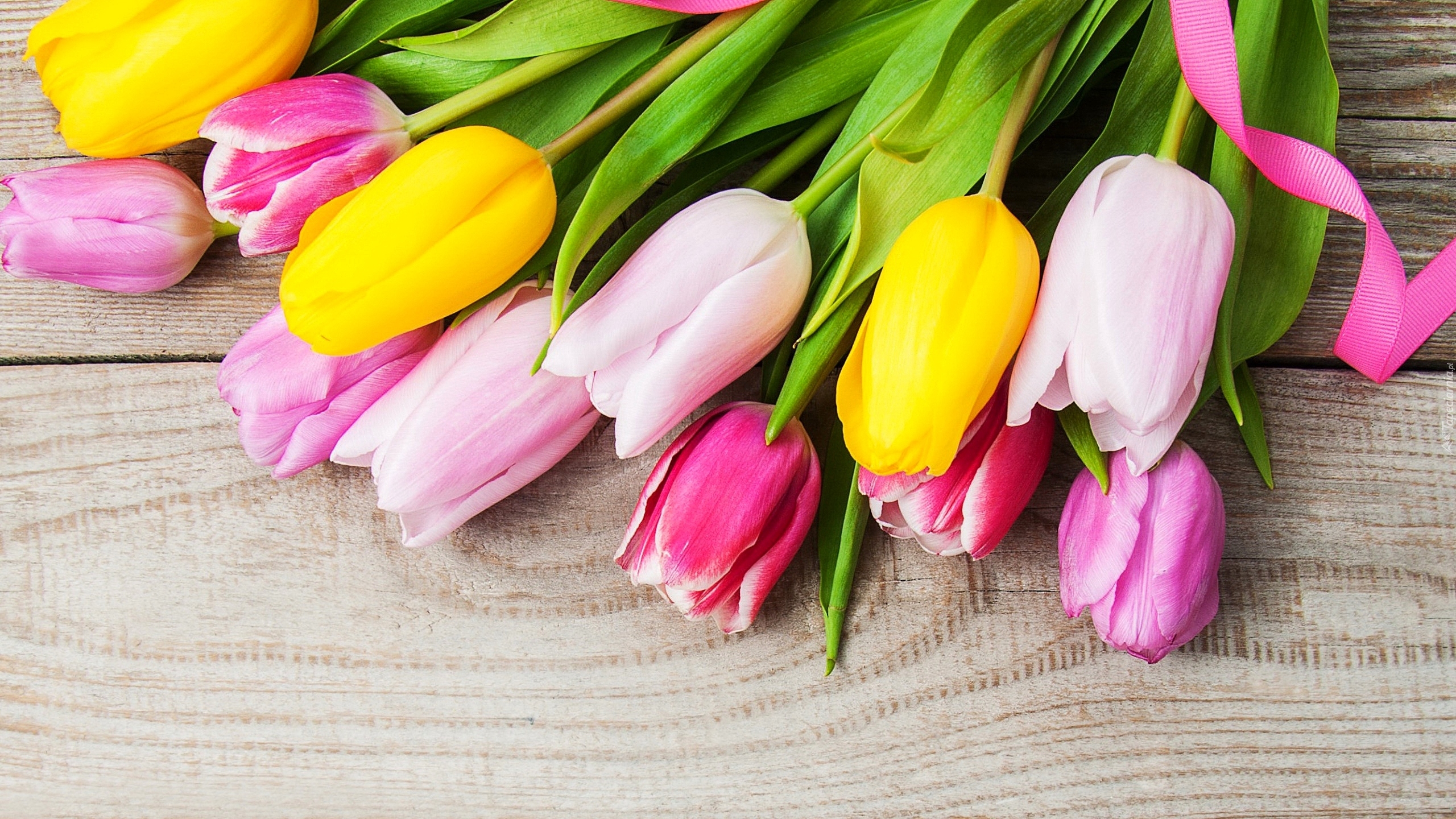 Edytor tapety: Kolorowe, Tulipany, Różowa, Wstążka, Deski