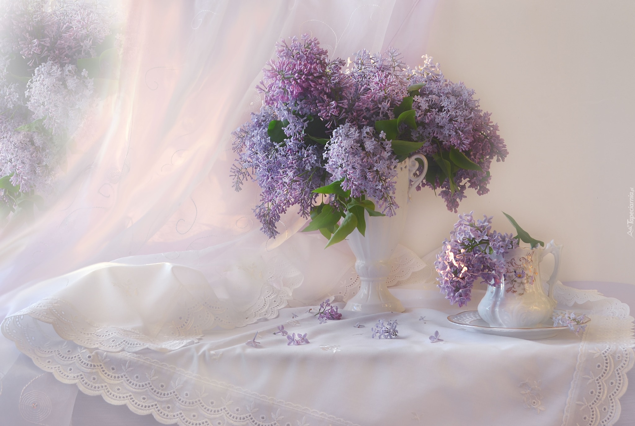 Edytor tapety: Fioletowy lilak w wazonie i dzbanuszku