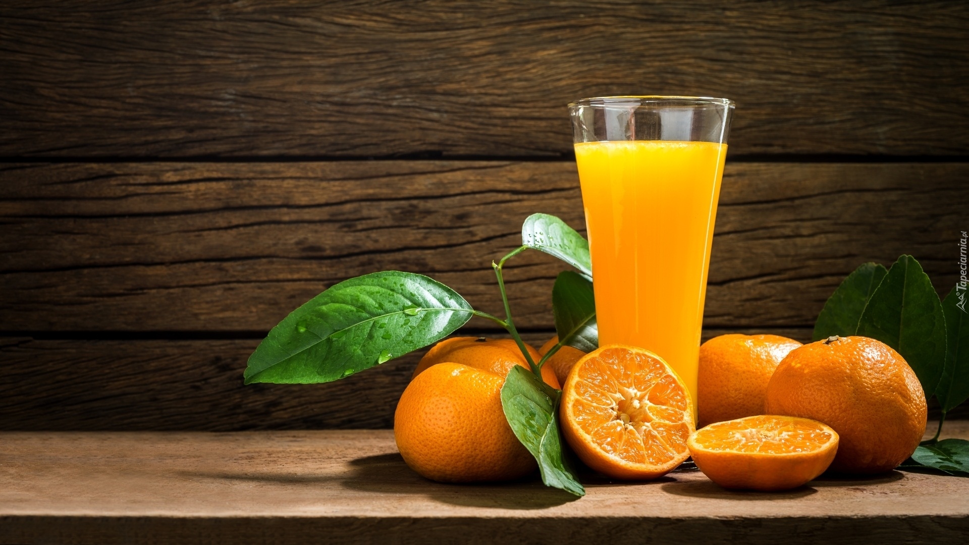 Edytor tapety: Pomarańcze położone obok szklanki z sokiem