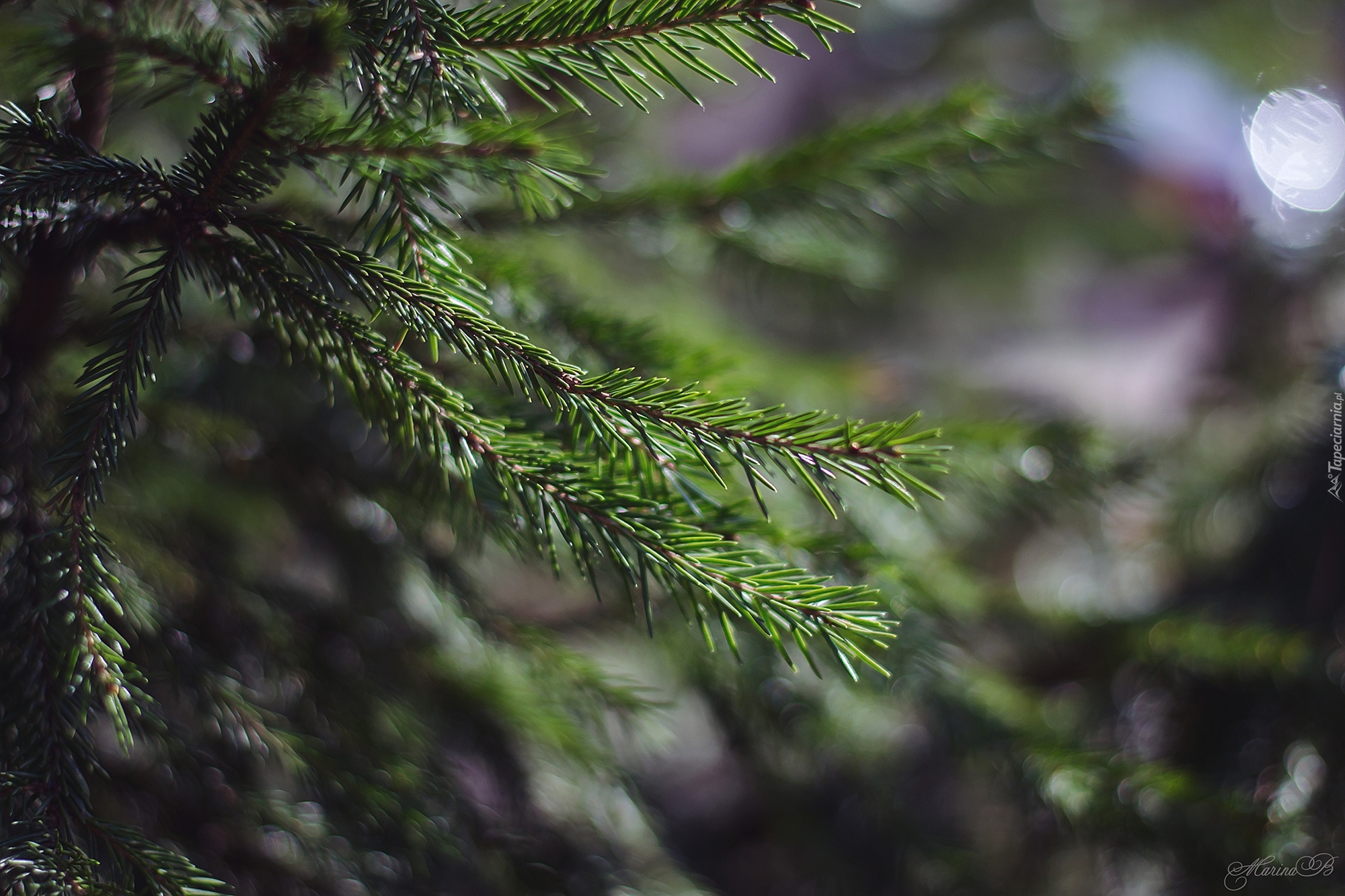 Edytor tapety: Świerkowa gałązka na rozmytym tle
