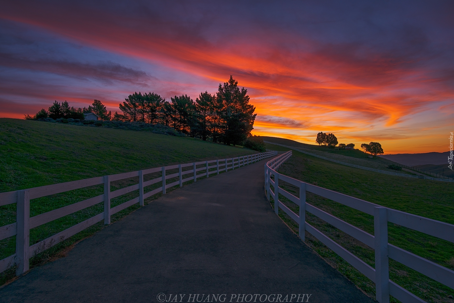 Edytor tapety: Ogrodzona droga na wzgórzu w zachodzącym słońcu