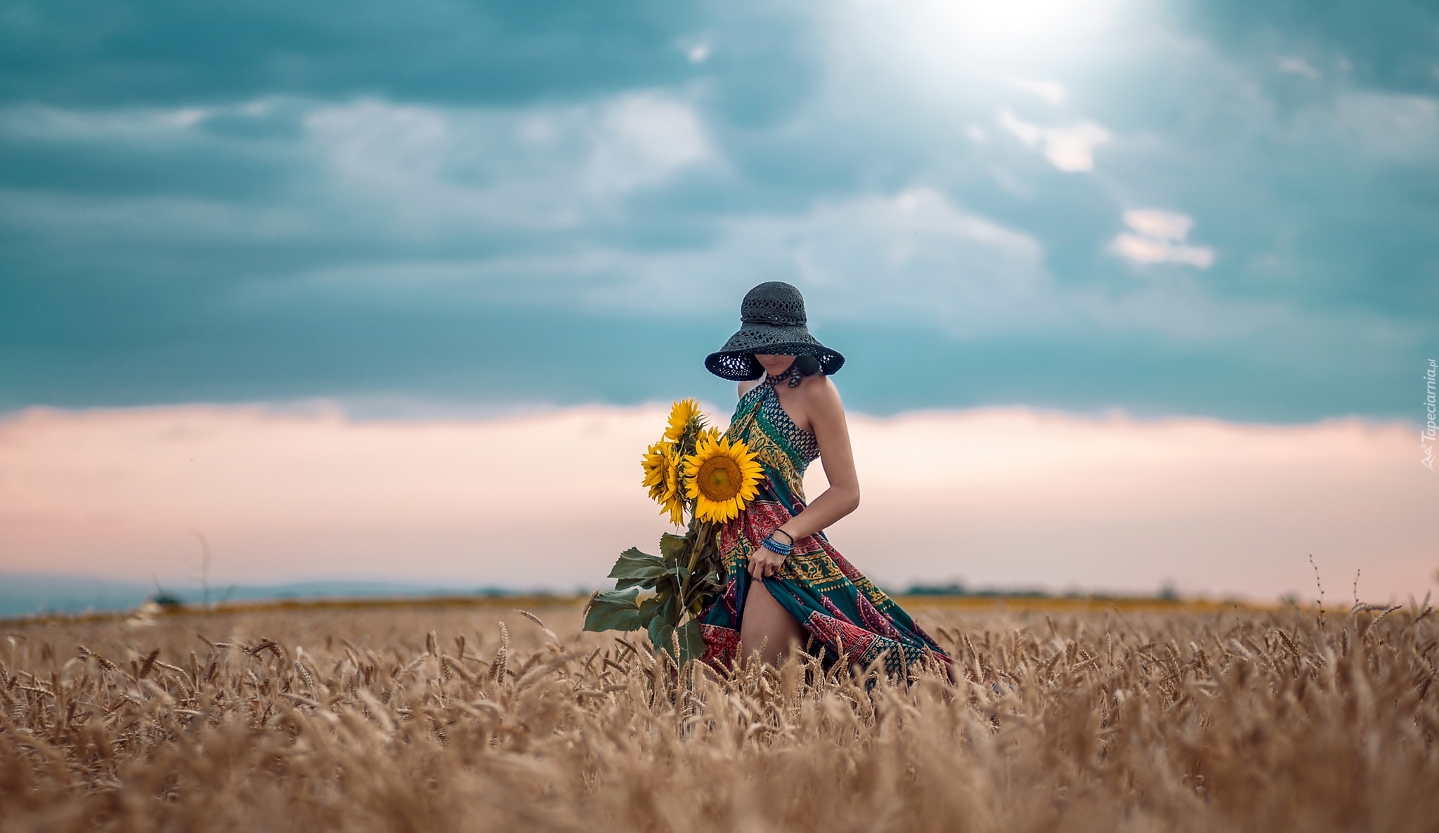 Edytor tapety: Kobieta w kapeluszu ze słonecznikami