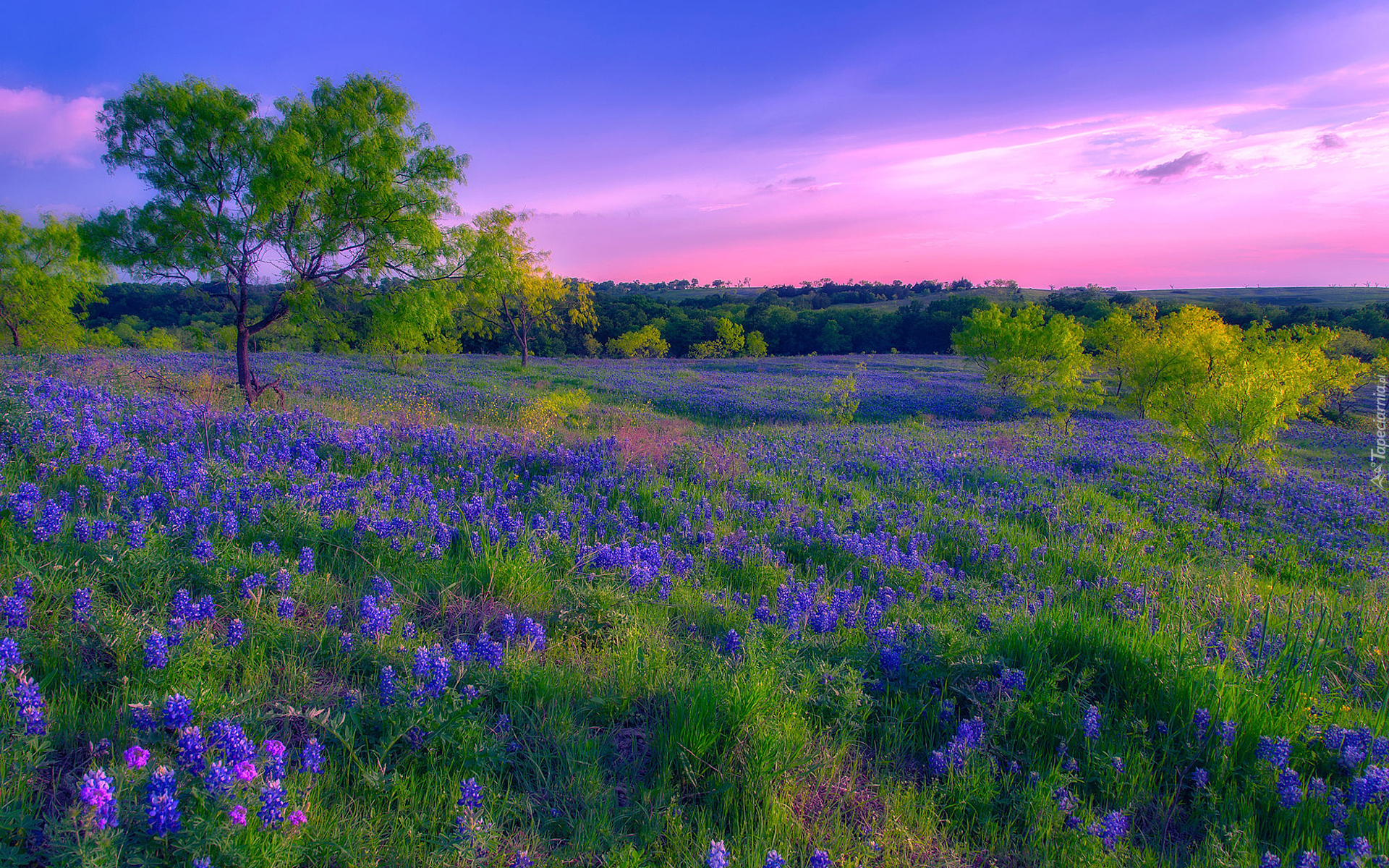 Edytor tapety: Drzewa na łubinowej łące