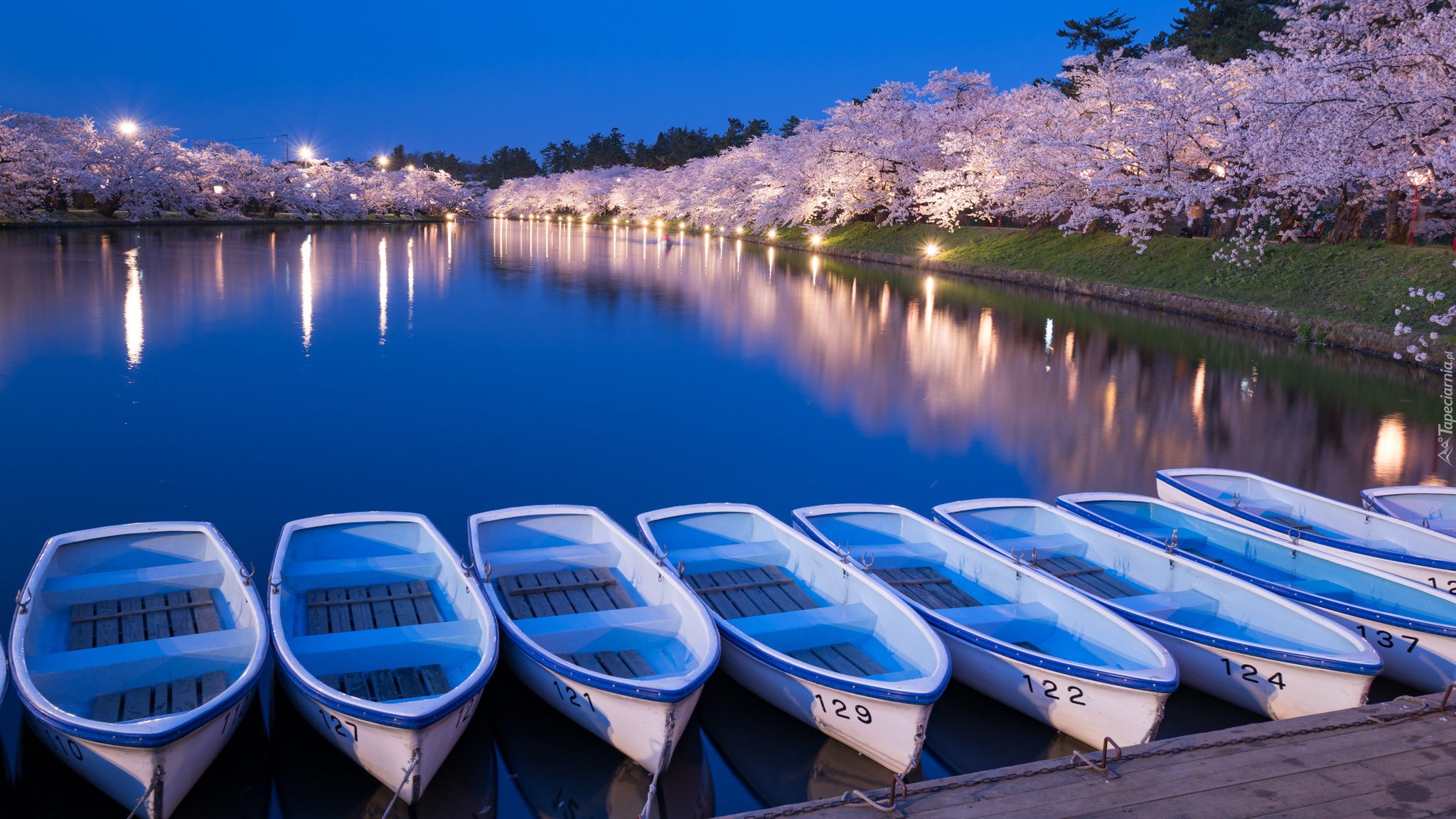 Edytor tapety: Łódki przycumowane przy brzegu jeziora w parku