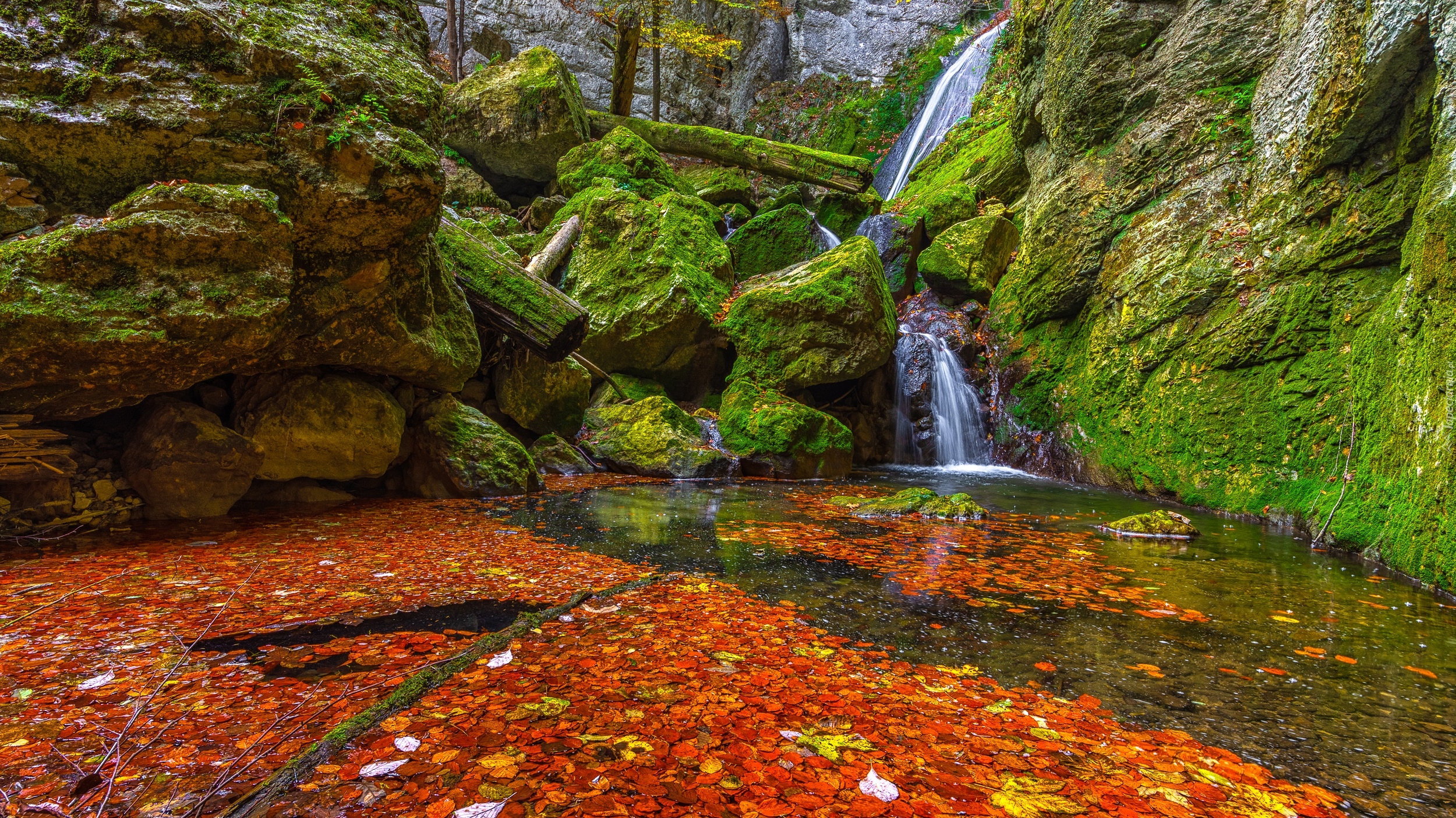 Edytor tapety: Woda spływająca po omszałych skałach do rzeki
