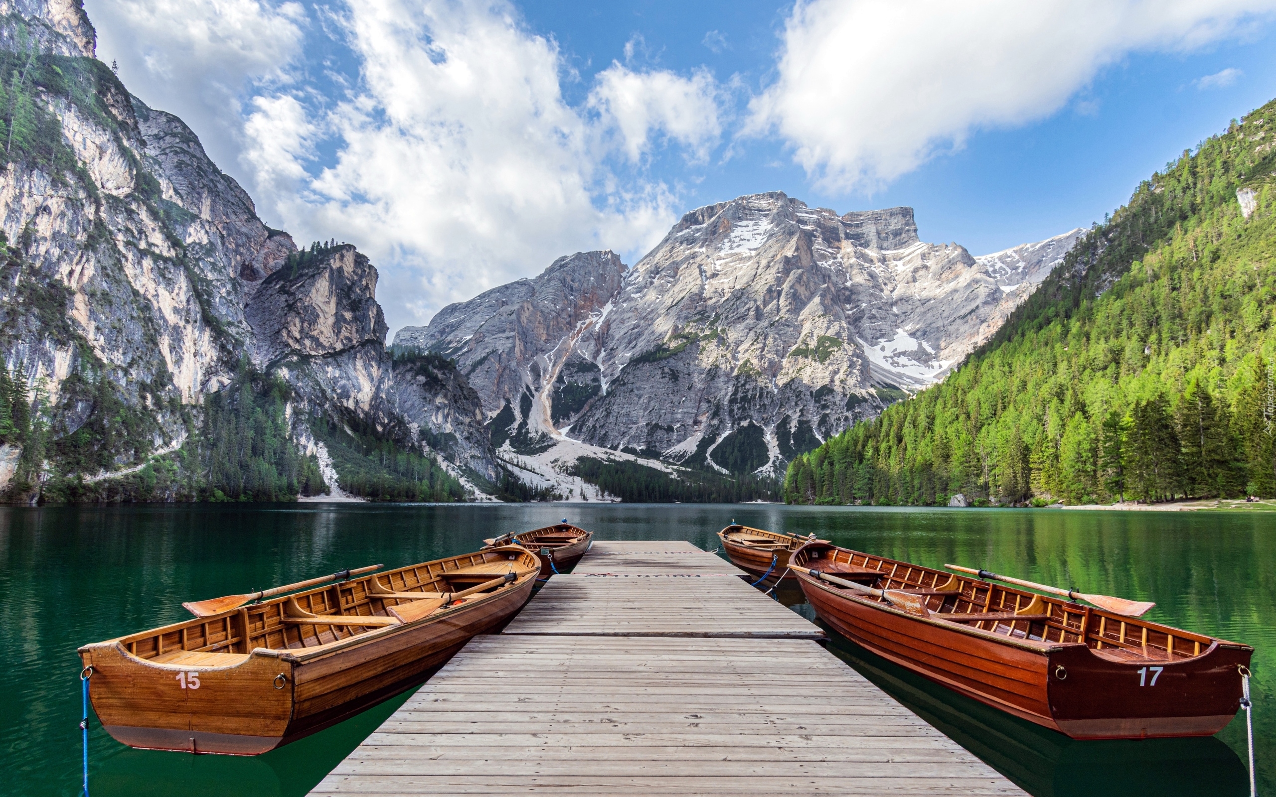 Edytor tapety: Łódki przy pomoście nad jeziorem Pragser Wildsee