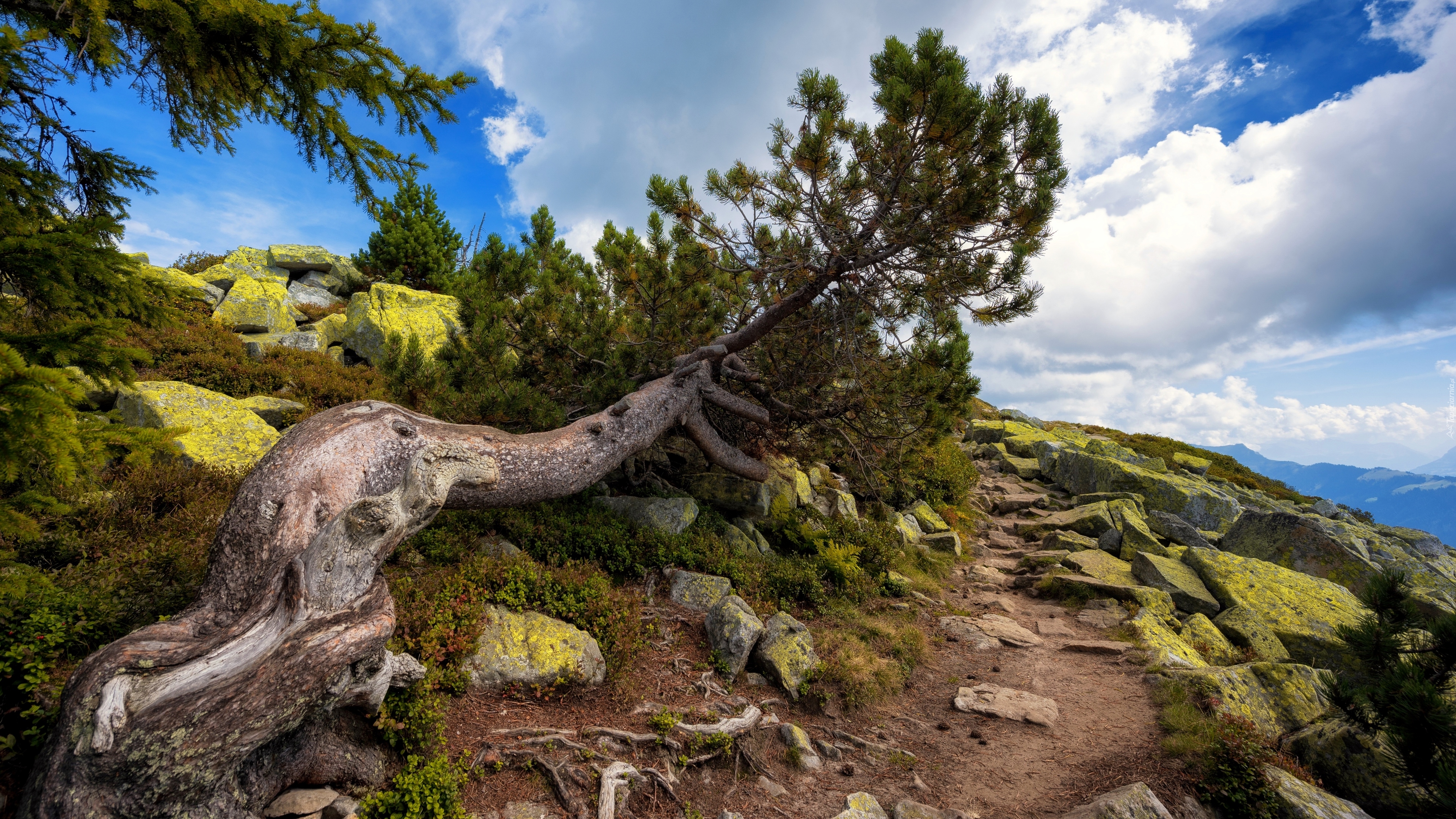 Edytor tapety: Powalona sosna wśród omszałych kamieni
