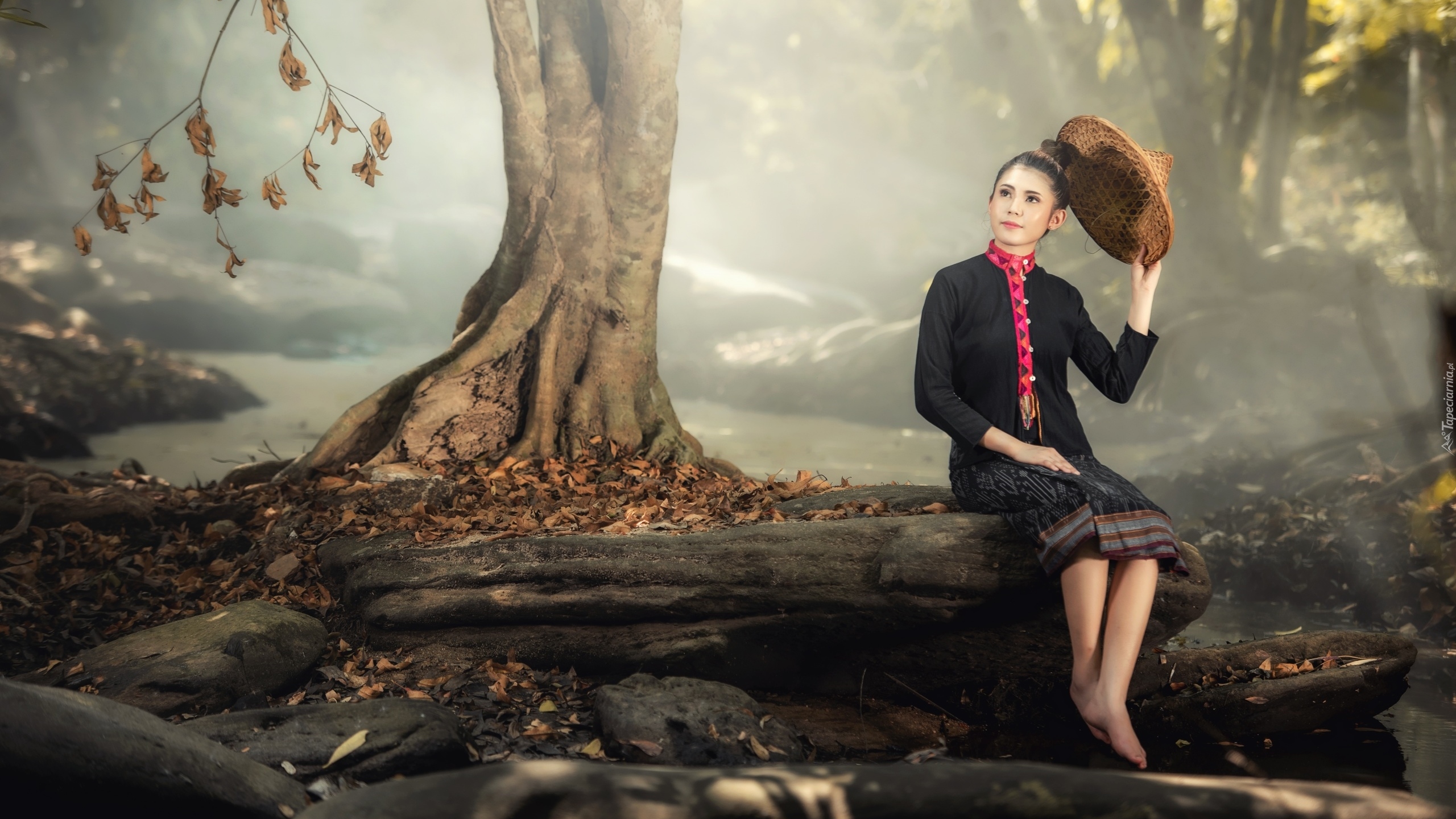 Edytor tapety: Dziewczyna siedząca na skale pod drzewem