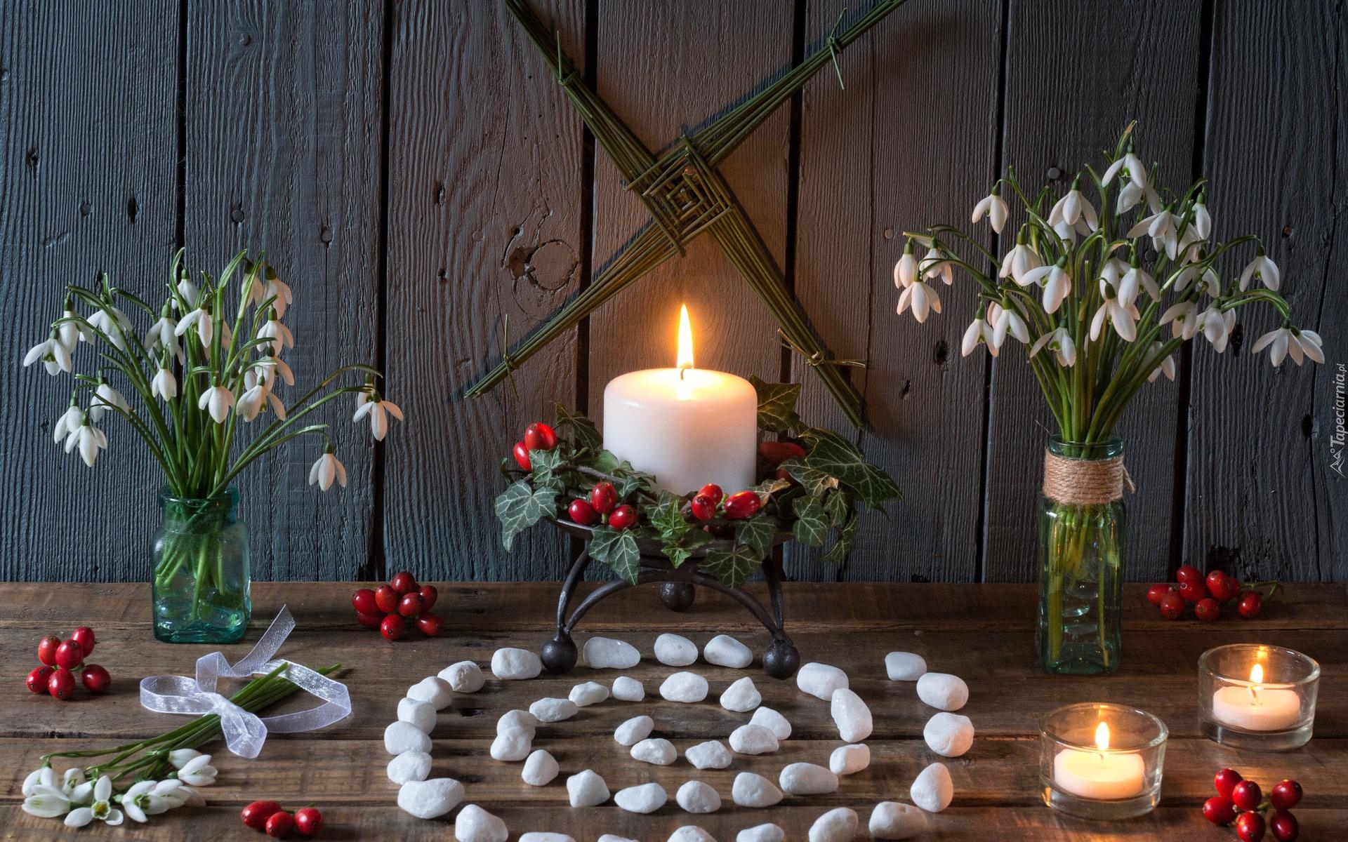 Edytor tapety: Świece obok przebiśniegów i rozłożonych kamyczków